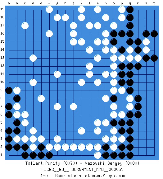 Last move : 1-0 2008 December 10 2:5:12 [Event "FICGS__GO__TOURNAMENT_KYU__000059"] [Site "FICGS"] [Date "2008.05.09"] [Round "1"] [Black "Tallant,Purity"] [White "Vazovski,Sergey"] [Result "1-0"] [Rating 1 "0070"] [Rating 2 "0000"] 1.q17 d4 2.q4 c17 3.k16 f16 4.r15 p6 5.r6 g3 6.q10 d10 7.o5 k4 8.q5 k15 9.l16 j16 10.k17 j15 11.q6 o7 12.q16 n14 13.p5 p15 14.q15 m15 15.l15 l14 16.m16 n16 17.n17 j17 18.j18 h18 19.h19 k18 20.j19 k19 21.g19 g18 22.o16 n15 23.o15 m17 24.l19 l17 25.l18 f19 26.m18 n18 27.n19 o17 28.p14 o14 29.p16 o10 30.q9 k10 31.o18 m19 32.o19 p18 33.q18 p13 34.q19 p19 35.q11 q13 36.r14 q14 37.q12 r13 38.r12 s14 39.o13 o12 40.n13 m13 41.n12 n11 42.m12 l12 43.m11 m10 44.p12 l11 45.s13 o13 46.t13 s15 47.s16 n3 48.q3 m5 49.q2 o2 50.q1 q7 51.r7 q8 52.r8 p9 53.n4 m4 54.o3 n5 55.n2 o4 56.p4 p3 57.p2 o3 58.o1 m2 59.n1 m1 60.p1 o6 61.l1 l2 62.k1 k2 63.j1 j2 64.h1 h2 65.g1 g2 66.f1 f2 67.d1 e1 68.e2 e3 69.f1 d2 70.e1 g7 71.c2 c3 72.b2 b3 73.a3 d3 74.b4 c5 75.c1 d13 76.b5 c6 77.a2 b6 78.a6 g11 79.t16 j7 80.p11 o11 81.p10 o9 82.o8 n8 83.a4 e8 84.a7 b7 85.b8 b9 86.a9 1-0 Here are the names of the openings (joseki) played in the four corners : Corner q4 : q4 p6 Hoshi (Hwajeom, Seongjeom, Xingwei`) 4-4 Point. The star or hoshi (4-4) point, emphasizing influence at the potential expense of territory. Player Black won this Go (weiqi, baduk) game. Follow this game move after move (download)Add one stone, then sacrifice both. (Anonymous) The ego is not master in its own house. (Sigmund Freud)