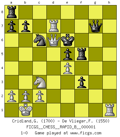 Last move : 1-0 2006 April 24 13:4:46 [Event "FICGS__CHESS__RAPID_B__000001"] [Site "FICGS"] [Date "2006.04.14"] [Round "1"] [White "Cridland,Graham"] [Black "De Vlieger,Filip"] [Result "1-0"] [WhiteElo "1700"] [BlackElo "1550"] 1.e4 c5 2.Nf3 d6 3.d4 cxd4 4.Nxd4 Nc6 5.Nc3 Bd7 6.Be2 Nf6 7.Be3 g6 8.Qd2 Bg7 9.O-O-O Ng4 10.Bxg4 Bxg4 11.f3 Bd7 12.h4 h5 13.Kb1 O-O 14.g4 hxg4 15.h5 gxf3 16.Qh2 Be5 17.Qh4 Bf6 18.Bg5 Bxg5 19.Qxg5 e5 20.Qh6 Qf6 21.hxg6 Qg7 22.gxf7+ Kxf7 23.Qxd6 Ke8 24.Ndb5 Kd8 25.Qc7+ Ke8 26.Nd6+ Ke7 27.Nf5+ Rxf5 28.Rxd7+ Ke6 29.Qd6+ 1-0 Sicilian Queenside Castling by player White (move 9) Kingside Castling by player Black (move 13) Player White won this chess game. Follow this game move after move (download)Pawns are born free, yet they are everywhere in chains. (Rick Kennedy) Vom Schach wurde gesagt das Leben sei dafür nicht lange genug. Aber das ist der Fehler des Lebens, nicht des Schach'. (Irving Chernev) No es una movida, aún la mejor movida que tu debas buscar, sino un plan comprensible. (Eugene Znosko-Borovsky) A chaque perte on perd un peu de soi. (Joël Lautier) I have opinions of my own - strong opinions - but I don't always agree with them. (George Bush)