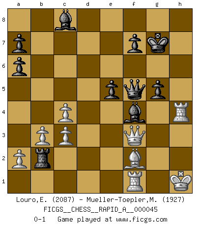 Last move : 0-1 2008 September 29 2:50:31 [Event "FICGS__CHESS__RAPID_A__000045"] [Site "FICGS"] [Date "2008.05.10"] [Round "1"] [White "Louro,Eugenio"] [Black "Mueller-Toepler,Michael"] [Result "0-1"] [WhiteElo "2087"] [BlackElo "1927"] 1.e4 c5 2.Nc3 d6 3.g3 Nc6 4.Bg2 g6 5.d3 Bg7 6.f4 e6 7.Nf3 Nge7 8.O-O O-O 9.Be3 Nd4 10.e5 Nef5 11.Bf2 Nxf3+ 12.Qxf3 Nd4 13.Qd1 dxe5 14.fxe5 Bxe5 15.Na4 Nf5 16.c3 c4 17.dxc4 Qc7 18.Qe2 h5 19.Nc5 h4 20.Na6 bxa6 21.Bxa8 hxg3 22.hxg3 Bxg3 23.b3 Bh2+ 24.Kg2 Be5 25.Qf3 Qe7 26.Rh1 Rd8 27.Rh3 Rd2 28.Kh1 Rc2 29.Be1 Rb2 30.Be4 Qg5 31.Rd1 Bf4 32.Bxf5 Qxf5 33.Rh4 e5 34.Bf2 Kg7 35.Rf1 g5 0-1 Sicilian : Closed Kingside Castling by player White (move 8) Kingside Castling by player Black (move 8) Player Black won this chess game. Follow this game move after move (download)I'm not a materialistic person, in that, I don't suffer the lack or loss of money. The absence of worldly goods I don't look back on. For Chess is a way I can be as materialistic as I want without having to sell my soul. (Jamie Walter Adams) Wie ich sie so einen nach dem anderen nieder mähte wurde meine Überlegenheit offensichtlich. (José Raúl Capablanca) Algunos sacrificios son sólidos, los demás son míos. (Mikhail Tal) Les échecs c'est le défi de l'alpiniste, toujours plus haut, prêt à tout pour monter à l'assaut du Roi ennemi. Les échecs, c'est de la musique en mouvement, un ballet majestueux pour les yeux. C'est de la poésie composée par les fantômes du passé qui au même titre que Rimbaud ou Verlaine méritent notre admiration. Les échecs, c'est de la peinture ou le moindre mouvement modifie le tableau pour en faire un Picasso ou un Van Gogh. Les échecs, c'est tout et rien, c'est la vie et la mort. Jjulie33 sur le forum de France-Echecs. To err is human, to shift the blame on someone else is tactical. (Mladen Jankovic)