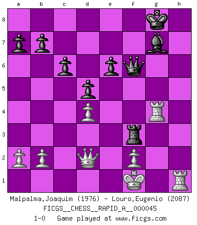 Last move : 1-0 2008 July 10 23:3:2 [Event "FICGS__CHESS__RAPID_A__000045"] [Site "FICGS"] [Date "2008.05.10"] [Round "1"] [White "Malpalma,Joaquim"] [Black "Louro,Eugenio"] [Result "1-0"] [WhiteElo "1976"] [BlackElo "2087"] 1.d4 d5 2.c4 Nf6 3.Nf3 dxc4 4.e3 Bg4 5.Bxc4 e6 6.h3 Bh5 7.Nc3 Nbd7 8.O-O c6 9.e4 Be7 10.Be2 O-O 11.Be3 Qc7 12.e5 Nd5 13.Nxd5 exd5 14.Bd3 Qb6 15.Bf5 Rfd8 16.Kh2 Nf8 17.Qc2 Bxf3 18.gxf3 g6 19.Rg1 Kh8 20.Bg4 Qc7 21.Bh6 Ne6 22.Bxe6 fxe6 23.Qd2 Bf6 24.h4 Bg7 25.h5 Rf8 26.hxg6 Rxf3 27.Rg4 Raf8 28.Rf1 Qe7 29.gxh7 R8f7 30.Bg5 Qf8 31.Kg2 Kxh7 32.Rh1+ Kg8 33.Bf6 R7xf6 34.exf6 Qxf6 35.Kf1 1-0 QGD : Marshall defense Kingside Castling by player White (move 8) Kingside Castling by player Black (move 10) Player White won this chess game. Follow this game move after move (download)Fischer is an American Chess tragedy on par with Morphy and Pillsbury. (Mig Greengard) Was ist der Unterschied zwischen einem Strassenarbeiter und einem Schachspieler? --Der Schachspieler bewegt sich ab und zu. (Anonymous) Dios mío, Bobby Fischer juega tan simple. (Alexei Suetin) Les Echecs sont et restent toujours un combat, un combat intégral comme la boxe, la lutte ou un autre sport, et où il doit y avoir un vainqueur et un vaincu. (Joseph Emil Diemer) All the biggest technological inventions created by man - the airplane, the automobile, the computer - says little about his intelligence, but speaks volumes about his laziness. (Mark Kennedy)
