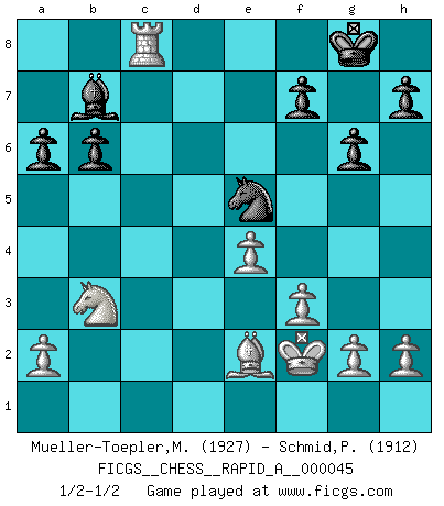 Last move : 1/2-1/2 2008 June 15 12:50:18 [Event "FICGS__CHESS__RAPID_A__000045"] [Site "FICGS"] [Date "2008.05.10"] [Round "1"] [White "Mueller-Toepler,Michael"] [Black "Schmid,Pablo"] [Result "1/2-1/2"] [WhiteElo "1927"] [BlackElo "1912"] 1.c4 Nf6 2.d4 g6 3.Nf3 Bg7 4.Nc3 d5 5.cxd5 Nxd5 6.e4 Nxc3 7.bxc3 c5 8.Be3 Qa5 9.Qd2 O-O 10.Rc1 cxd4 11.cxd4 Qxd2+ 12.Nxd2 e6 13.Nb3 b6 14.Bb5 Bb7 15.f3 a6 16.Bc4 Rc8 17.Kf2 Nd7 18.Bf4 e5 19.dxe5 Bxe5 20.Bxe5 Nxe5 21.Be2 Rxc1 22.Rxc1 Rc8 23.Rxc8+ 1/2-1/2 English, 1...Nf6 (Anglo-Indian defense) Kingside Castling by player Black (move 9) This chess game ended in a draw. Follow this game move after move (download)Discovered check is the dive bomber of the Chessboard. (Reuben Fine) Wenn Spassky eine Figur opfert kannst du genauso gut aufgeben. Aber wenn Tal eine Figur opfert, spiel weiter. Er könnte noch eine weitere opfern, und dann ... wer weiß? (Miguel Najdorf) Bendita sea la memoria de aquel que dio al mundo este juego inmortal. (A. G. Gardiner) On n'a jamais que l'âge auquel on a commence à jouer aux échecs car après on cesse de vieillir. (Capablanca) I find television to be very educating. Every time somebody turns on the set, I go in the other room and read a book. (Groucho Marx)