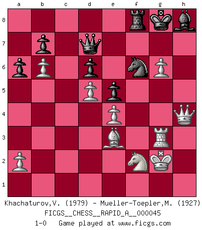 Last move : 1-0 2008 July 11 11:35:21 [Event "FICGS__CHESS__RAPID_A__000045"] [Site "FICGS"] [Date "2008.05.10"] [Round "1"] [White "Khachaturov,Vadim"] [Black "Mueller-Toepler,Michael"] [Result "1-0"] [WhiteElo "1979"] [BlackElo "1927"] 1.d4 Nf6 2.c4 g6 3.Nc3 Bg7 4.e4 d6 5.Be2 O-O 6.Bg5 Na6 7.Qd2 e5 8.d5 c6 9.f3 cxd5 10.cxd5 Bd7 11.g4 h6 12.Be3 h5 13.g5 Ne8 14.h4 Nc5 15.b4 Na4 16.Nxa4 Bxa4 17.b5 a6 18.b6 Rc8 19.Rc1 Rxc1+ 20.Qxc1 f6 21.Nh3 Bd7 22.Kf2 f5 23.Kg2 fxe4 24.fxe4 Bg4 25.Bxg4 hxg4 26.Nf2 Qd7 27.Qd1 Rf3 28.Qd3 Bf8 29.h5 gxh5 30.Rxh5 Be7 31.Qe2 Bf8 32.Rh4 Rf7 33.Rxg4 Bg7 34.Rg3 Bh8 35.g6 Rf8 36.Qh5 Nf6 37.Qh4 1-0 King's Indian : Averbakh system Kingside Castling by player Black (move 5) Player White won this chess game. Follow this game move after move (download)It is not a move, even the best move that you must seek, but a realizable plan. (Eugene Znosko-Borovsky) Obwohl ich vom Stil her kaum zu den Priestern der Schachkunst gezählt werde, halte ich Schach doch für eine Kunst. (Tigran Petrosjan) Aquellos que dicen que entienden al Ajedrez, no entienden nada. (Robert Hubner) J'ai vu le vaincu d'Echecs jouer des années durant dans l'espoir de la fête de la victoire. Car tu es plus riche de ce qu'elle existe si même elle n'est point pour toi. Ainsi de la perle du fond des mers. (Antoine de Saint-Exupéry) In God we trust, all others we virus scan. (Anonymous)