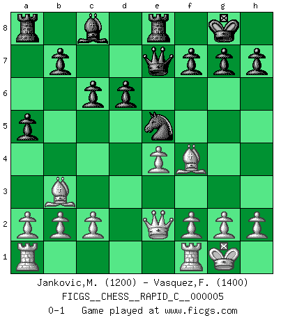 Last move : 0-1 2006 September 18 18:55:2 [Event "FICGS__CHESS__RAPID_C__000005"] [Site "FICGS"] [Date "2006.07.15"] [Round "1"] [White "Jankovic,Mladen"] [Black "Vasquez,Fernando"] [Result "0-1"] [WhiteElo "1200"] [BlackElo "1400"] 1.e4 e5 2.Nf3 d6 3.Bc4 Be7 4.O-O Nf6 5.d4 exd4 6.Qxd4 Nc6 7.Qe3 O-O 8.Nc3 Ng4 9.Qe2 Nge5 10.Nxe5 Nxe5 11.Nd5 c6 12.Nxe7 Qxe7 13.Bf4 Re8 14.Bb3 a5 0-1 Philidor's defense Kingside Castling by player White (move 4) Kingside Castling by player Black (move 7) Player Black won this chess game. Follow this game move after move (download)A good player is always lucky. (Jose Raul Capablanca) Drei Punkte vor allen anderen ist wie einer, der im weißen Anzug posiert, während der Rest in Müllsäcke gekleidet dasteht. (Viktor Kortschnoi) En un gambito tu regalas un Peón por el bién de tomar un juego perdido. (Samuel Standige Boden) Toute estimation doit être constamment réévaluée. (Jacob Estrin) There are two types of people in this world, good and bad. The good sleep better, but the bad seem to enjoy the waking hours much more. (Woody Allen)