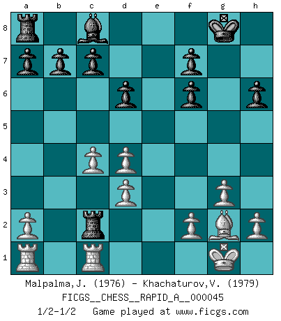 Last move : 1/2-1/2 2008 May 25 9:16:33 [Event "FICGS__CHESS__RAPID_A__000045"] [Site "FICGS"] [Date "2008.05.10"] [Round "1"] [White "Malpalma,Joaquim"] [Black "Khachaturov,Vadim"] [Result "1/2-1/2"] [WhiteElo "1976"] [BlackElo "1979"] 1.c4 e5 2.Nc3 Nf6 3.Nf3 Nc6 4.g3 Bb4 5.Bg2 O-O 6.O-O e4 7.Ng5 Bxc3 8.bxc3 Re8 9.Qc2 Qe7 10.d3 exd3 11.exd3 d6 12.Nf3 Qe2 13.Qxe2 Rxe2 14.Bg5 Rc2 15.Nd4 Nxd4 16.cxd4 h6 17.Bxf6 gxf6 18.Rfc1 Rd2 19.Rd1 Rc2 20.Rdc1 1/2-1/2 English Opening Kingside Castling by player Black (move 5) Kingside Castling by player White (move 6) This chess game ended in a draw. Follow this game move after move (download)The chessboard is the world, the pieces are the phenomena of the Universe, the rules of the game are what we call the laws of Nature and the player on the other side is hidden from us. (Thomas Huxley) Es ist schade, dass viele Schachsportler vergessen, wie wichtig Auftreten und angemessene Kleidung sind. (Alexandra Kosteniuk) Coloca el contenido del tablero de Ajedrez en un sombrero, agita las piezas vigorosamente, derrámalas en el tablero desde una altura de medio metro y así obtienes el estilo de Wilhelm Steinitz. (H. E. Bird) En blitz, le Cavalier l'emporte sur le Fou. (Vlastimil Hort) If passion drives you, let reason holds the reins. (Benjamin Franklin)