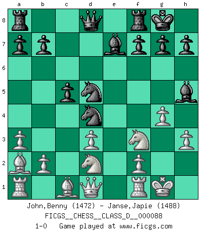 Last move : 1-0 2008 August 13 2:10:56 [Event "FICGS__CHESS__CLASS_D__000088"] [Site "FICGS"] [Date "2008.05.10"] [Round "1"] [White "John,Benny"] [Black "Janse,Japie"] [Result "1-0"] [WhiteElo "1472"] [BlackElo "1488"] 1.e4 c5 2.Bc4 e6 3.a3 d5 4.exd5 exd5 5.Ba2 Nf6 6.d3 Be7 7.Nf3 O-O 8.O-O Bg4 9.c4 Nc6 10.cxd5 Nxd5 11.Nbd2 Nd4 12.h3 Bh5 13.g4 1-0 Sicilian defense Kingside Castling by player Black (move 7) Kingside Castling by player White (move 8) Player White won this chess game. Follow this game move after move (download)He who fears an isolated Queen's Pawn should give up Chess. (Siegbert Tarrasch) Nach Morphy wurde nichts neues mehr in der Behandlung offener Positionen gefunden. (Mikhail Moiseyevich Botvinik) El Ajedrez es un cuento de Hadas de las 1001 metidas de pata. (Savielly Tartakower) La solitude du joueur d'Echecs à l'approche du mat est semblable à celle du condamné. (Francis Szpiner) Whatever you do, don't be bored. This is absolutely the most exciting time we could have possibly hoped to be alive. And things are just starting. (From movie Waking life)