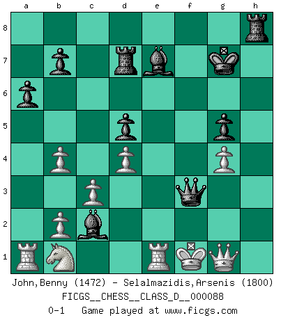 Last move : 0-1 2008 December 30 20:9:0 [Event "FICGS__CHESS__CLASS_D__000088"] [Site "FICGS"] [Date "2008.05.10"] [Round "1"] [White "John,Benny"] [Black "Selalmazidis,Arsenis"] [Result "0-1"] [WhiteElo "1472"] [BlackElo "1800"] 1.e4 c6 2.Bc4 d5 3.exd5 cxd5 4.Bb3 Nf6 5.d3 Nc6 6.h3 e5 7.Bg5 Be7 8.Nf3 h6 9.Bh4 Be6 10.O-O O-O 11.d4 e4 12.Nh2 Qb6 13.c3 Rad8 14.Bxf6 Bxf6 15.Ng4 Be7 16.Ne3 f5 17.Qh5 Na5 18.Nd2 Kh7 19.Qd1 g5 20.f3 f4 21.Ng4 h5 22.Nh2 Nxb3 23.axb3 e3 24.Nb1 Bf5 25.b4 a6 26.Ra5 Rd7 27.Re1 Rc8 28.Nf1 Qg6 29.g4 hxg4 30.hxg4 Bc2 31.Qc1 Kg7 32.Ra1 Rh8 33.Nxe3 fxe3 34.Qxe3 Qh6 35.Kf1 Qh1+ 36.Qg1 Qxf3+ 0-1 Caro-Kann : Hillbilly attack Kingside Castling by player White (move 10) Kingside Castling by player Black (move 10) Player Black won this chess game. Follow this game move after move (download)In the perfect Chess combination as in a first-rate short story, the whole plot and counter-plot should lead up to a striking finale, the interest not being allayed until the very last moment. (Yates and Winter) Je mehr wir mit Computern analysieren, desto mehr glauben wir an Verteidigung. (Vladimir Kramnik) Personalmente, yo prefiero mirar hacia el futuro en donde un programa de computadora gane el título mundial de Ajedrez. La humanidad necesita una lección de humildad. (Richard Dawkings) C'est la seule position que je connaisse où les deux camps sont mals. Propos prêtés à V. Anand. The best teachers teach from the heart, not from the book. (Author unknown)