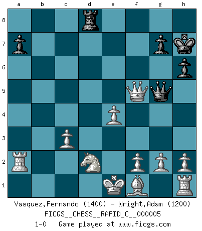 Last move : 1-0 2006 October 6 19:18:35 [Event "FICGS__CHESS__RAPID_C__000005"] [Site "FICGS"] [Date "2006.07.15"] [Round "1"] [White "Vasquez,Fernando"] [Black "Wright,Adam"] [Result "1-0"] [WhiteElo "1400"] [BlackElo "1200"] 1.e4 e5 2.Nf3 Nf6 3.Nxe5 Nxe4 4.Qe2 d5 5.d3 Bd6 6.Nf3 Bf5 7.Nd4 O-O 8.Nxf5 Qf6 9.dxe4 Be5 10.Nd2 Bxb2 11.Bxb2 Qxb2 12.Ne7+ Kh8 13.Rb1 Qxa2 14.Nxd5 c6 15.Nc7 Na6 16.Nxa8 Rxa8 17.Qc4 Qa5 18.Rxb7 Rd8 19.c3 Nc5 20.Rb2 Na4 21.Ra2 Qg5 22.Qxa4 h6 23.Qxc6 f5 24.Qc5 Kh7 25.Qxf5+ 1-0 Petrov : Damiano variation Kingside Castling by player Black (move 7) Player White won this chess game. Follow this game move after move (download)The boy (then a 12 year old boy named Anatoly Karpov) doesn't have a clue about Chess, and there's no future at all for him in this profession. (Mikhail Botvinnik) Bis jetzt ist Weiß einer wohlbekannten Analyse gefolgt. Aber jetzt begeht er einen schrecklichen Fehler: Er beginnt seinen eigenen Kopf zu benutzen. (Siegbert Tarrasch) Al jugar al Ajedrez entonces, podemos aprender: Primero: Previsión... Segundo: Prudencia... Tercero: Cautela... Y al final, aprendemos del Ajedrez el hábito de no ser desanimados por apariencias malas presentes en el estado de nuestros asuntos, el hábito de la esperanza por una oportunidad favorable y la perseveración de los secretos de los recursos. (Benjamin Franklin) Vous savez, camarade Pachman, je n'éprouve pas de plaisir à être ministre, je jouerais plutôt aux échecs comme vous, ou alors ferais une révolution au Venezuela. (Che Guevara à Ludek Pachman, 'Checkmate in Prague', 1975) The Internet is the first thing that humanity has build that humanity doesn't understand, the largest experiment in anarchy that we have ever had. (Eric Schmidt)