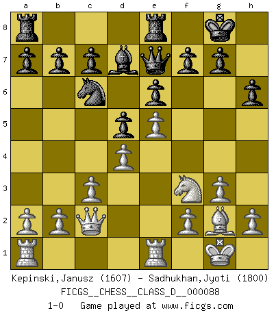 Last move : 1-0 2008 August 7 5:14:40 [Event "FICGS__CHESS__CLASS_D__000088"] [Site "FICGS"] [Date "2008.05.10"] [Round "1"] [White "Kepinski,Janusz"] [Black "Sadhukhan,Jyoti"] [Result "1-0"] [WhiteElo "1607"] [BlackElo "1800"] 1.d4 d5 2.g3 Nf6 3.Bg2 Nc6 4.Bg5 e6 5.Nf3 Bb4+ 6.c3 Be7 7.O-O O-O 8.Nbd2 h6 9.Bxf6 Bxf6 10.Re1 Re8 11.e4 Bd7 12.e5 Bg5 13.Nxg5 Qxg5 14.Nf3 Qe7 15.Qc2 1-0 This chess game has been lost on time (started : 2008.05.10 1:55:21) Queen's pawn game Kingside Castling by player White (move 7) Kingside Castling by player Black (move 7) Player White won this chess game. Follow this game move after move (download)There must have been a time when men were demigods, or they could not have invented Chess. (Gustav Schenk) Wer der Ansicht ist, daß alle Schachspieler verrückt sind, wird durch Studium des Lebens von Emil Josef Diemer nicht auf andere Gedanken kommen. (Hans Ree) El Ajedrez es un invernadero donde los frutos del carácter pueden madurar mas completamente que en la vida. (Edward Morgan Foster) Aux échecs, l'amour-propre est satisfait quand on remporte la victoire, mais il n'y a pas de honte à être battu. (Benjamin Franklin) Warrior pose battles inner weakness and wins focus. You see that there is no war within you. You're on your own side, and you are your own strength. (Terri Guillemets)