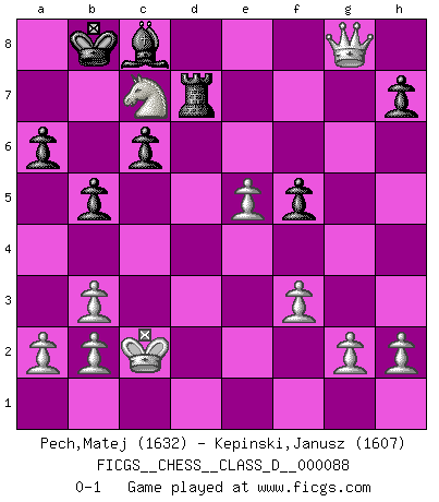 Last move : 0-1 2008 November 25 22:58:25 [Event "FICGS__CHESS__CLASS_D__000088"] [Site "FICGS"] [Date "2008.05.10"] [Round "1"] [White "Pech,Matej"] [Black "Kepinski,Janusz"] [Result "0-1"] [WhiteElo "1632"] [BlackElo "1607"] 1.e4 e6 2.d4 d5 3.Nc3 Nf6 4.Bg5 dxe4 5.Nxe4 Be7 6.Bxf6 gxf6 7.Nf3 b6 8.Bb5+ c6 9.Bc4 Bb7 10.Qe2 f5 11.Ng3 Qc7 12.Ne5 Bd6 13.O-O-O Rf8 14.Rhe1 Bxe5 15.dxe5 Nd7 16.Nxf5 O-O-O 17.Nd6+ Kb8 18.Kb1 b5 19.Bb3 Nc5 20.Qe3 Nxb3 21.cxb3 a6 22.f3 Rd7 23.Rd2 Rfd8 24.Red1 f5 25.Qh6 Rg8 26.Qxe6 Bc8 27.Qxg8 Rd8 28.Ne8 Rxd2 29.Nxc7 Rxd1+ 30.Kc2 Rd7 0-1 French : Burn variation Queenside Castling by player White (move 13) Queenside Castling by player Black (move 16) Player Black won this chess game. Follow this game move after move (download)To avoid losing a piece, many a person has lost the game. (Savielly Tartakover) Ich tröste mich mit dem Vergnügen, daß Schachfans, Zuschauer und Leser glücklich sind, wenn ein Großmeister etwas riskiert, statt nur Klötzchen zu schieben. (Mikhail Nekhemyevich Tal) Si pudieramos observar el interior de la cabeza de un jugador de Ajedrez, encontraríamos ahí un mundo lleno de sentimientos, imágenes, ideas, emoción y pasión. (Alfred Binet) Il n'y a pas eu de défaite parce que je ne crois pas que cet ordinateur ait jamais existé. IBM a triché en refusant d'imprimer les modes de recherche de la machine. C'est évident, pendant le match, des coups décisifs ont été joués par des êtres humains. Aujourd'hui, les meilleurs spécialistes en informatique ne peuvent toujours pas expliquer comment Deep-Blue a pu jouer contre la logique des ordinateurs. IBM a gagné une guerre de communication, mais ils sont incapables de prouver que l'ordinateur a gagné tout seul. (Garry Kasparov) The Movers & Shakers of this world are those who play chess in the mornings and go to the disco in the evenings. (Dinesh De Silva)