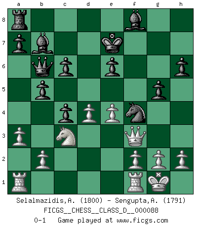 Last move : 0-1 2008 May 15 20:21:12 [Event "FICGS__CHESS__CLASS_D__000088"] [Site "FICGS"] [Date "2008.05.10"] [Round "1"] [White "Selalmazidis,Arsenis"] [Black "Sengupta,Arnab"] [Result "0-1"] [WhiteElo "1800"] [BlackElo "1791"] 1.d4 d5 2.c4 e6 3.Nc3 c6 4.Nf3 Nf6 5.Bg5 h6 6.Bh4 dxc4 7.e4 g5 8.Bg3 b5 9.a3 Qa5 10.Nd2 Nbd7 11.Be2 Qb6 12.Nf3 Bb7 13.O-O Nh5 14.Be5 Nxe5 15.Nxe5 Nf4 16.Bh5 Rh7 17.Bxf7+ Rxf7 18.Nxf7 Kxf7 19.Qf3 Ke7 0-1 QGD : Semi-Slav Kingside Castling by player White (move 13) Player Black won this chess game. Follow this game move after move (download)By playing at Chess then, we may learn: First: Foresight... Second: Circumspection... Third: Caution... And lastly, we learn by Chess the habit of not being discouraged by present bad appearances in the state of our affairs, the habit of hoping for a favorable chance, and that of persevering in the secrets of resources. (Benjamin Franklin) Die Partien sind immer verschieden, die Interviews immer die gleichen. (Garry Kasparov) Cuando tu casa esta en llamas, no puedes ser molestado por tus vecinos. O, como decinos en Ajedrez, si tu Rey esta bajo ataque, no te preocupa perder un Peón del lado de la Reina. (Gary Kasparov) Mon pion favori sur ma case favorite ! Bronstein en parlant d'un coup de pion en h5 quand il avait les Noirs. To send light into the darkness of men's hearts - such is the duty of the artist. (Schumann)
