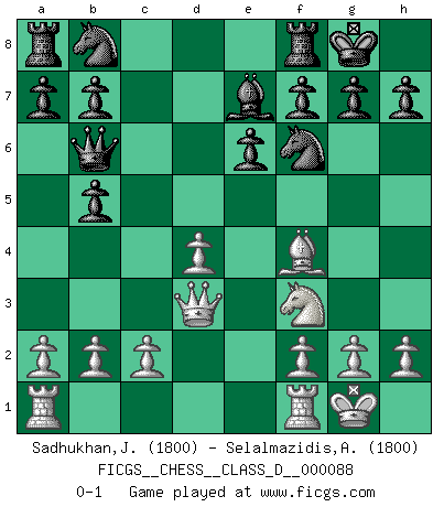 Last move : 0-1 2008 August 5 5:0:39 [Event "FICGS__CHESS__CLASS_D__000088"] [Site "FICGS"] [Date "2008.05.10"] [Round "1"] [White "Sadhukhan,Jyoti"] [Black "Selalmazidis,Arsenis"] [Result "0-1"] [WhiteElo "1800"] [BlackElo "1800"] 1.e4 d5 2.exd5 Qxd5 3.Nc3 Qa5 4.Nf3 Nf6 5.d4 c6 6.Bd2 Bf5 7.Nb5 Qb6 8.Bf4 cxb5 9.Be2 e6 10.O-O Be7 11.Bd3 Bxd3 12.Qxd3 O-O 0-1 This chess game has been lost on time (started : 2008.05.10 1:55:21) Scandinavian (centre counter) defense Kingside Castling by player White (move 10) Kingside Castling by player Black (move 12) Player Black won this chess game. Follow this game move after move (download)If your opponent cannot do anything active, then don't rush the position; instead you should let him sit there, suffer, and beg you for a draw. (Jeremy Silman) Die Elozahlen sind sehr schlecht für das Schach. Jetzt ist Schach eine Sportindustrie, die darauf zielt Elopunkte zu machen. (Miguel Najdorf) El estómago es una parte esencial del maestro de Ajedrez. (Bent Larsen) Les échecs sont utiles à l'exercice de la faculté de penser et à celle de l'imagination. Car nous devons posséder une méthode élaborée pour atteindre des buts partout où nous devons conduire notre raison. (Leibnitz) There is a very easy way to return from a casino with a small fortune : go there with a large one. (Jack Yelton)