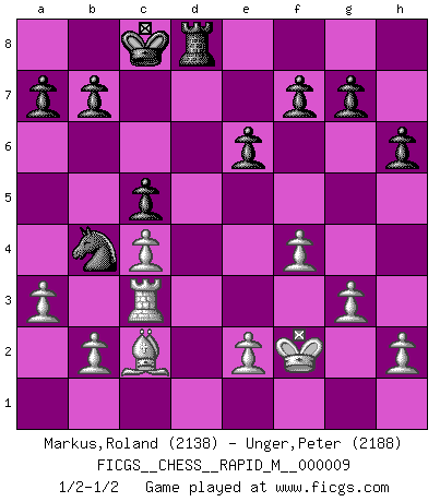 Last move : 1/2-1/2 2008 June 3 0:35:22 [Event "FICGS__CHESS__RAPID_M__000009"] [Site "FICGS"] [Date "2008.05.10"] [Round "1"] [White "Markus,Roland"] [Black "Unger,Peter"] [Result "1/2-1/2"] [WhiteElo "2138"] [BlackElo "2188"] 1.g3 d5 2.Nf3 Nf6 3.Bg2 Bf5 4.c4 e6 5.O-O c6 6.d3 dxc4 7.dxc4 Qxd1 8.Rxd1 Nbd7 9.Nc3 h6 10.Be3 Ng4 11.Bd2 O-O-O 12.Rac1 Bb4 13.Ne4 Be7 14.Nh4 Bh7 15.Bc3 Bxe4 16.Bxe4 Bf6 17.Nf3 Bxc3 18.Rxc3 Nge5 19.Nxe5 Nxe5 20.Rxd8+ Rxd8 21.Bc2 c5 22.f4 Nc6 23.Kf2 Nb4 24.a3 1/2-1/2 Benko's Opening Kingside Castling by player White (move 5) Queenside Castling by player Black (move 11) This chess game ended in a draw. Follow this game move after move (download)A sacrifice is best refuted by accepting it. (Wilhelm Steinitz) Der Umstand, daß uns eine 7 Stunden Zeitkontrolle ermöglicht eine großartige, tiefe Partie zu spielen, ist für die Massenmedien nicht weiter von Bedeutung. (Alexej Shirov) Un mal día en el Ajedrez, es mejor que cualquier buen día en el trabajo. (Anonymous) Les échecs c'est le défi de l'alpiniste, toujours plus haut, prêt à tout pour monter à l'assaut du Roi ennemi. Les échecs, c'est de la musique en mouvement, un ballet majestueux pour les yeux. C'est de la poésie composée par les fantômes du passé qui au même titre que Rimbaud ou Verlaine méritent notre admiration. Les échecs, c'est de la peinture ou le moindre mouvement modifie le tableau pour en faire un Picasso ou un Van Gogh. Les échecs, c'est tout et rien, c'est la vie et la mort. Jjulie33 sur le forum de France-Echecs. Hello Thibault, if I have had a plan (and I had one, I hope), I have forgotten it during the last week... - Hello Heinz-Georg. What do you mean a plan ? (Anonymous players, during a Big Chess game)