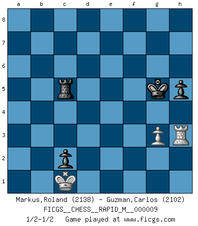 Last move : 1/2-1/2 2008 September 26 22:21:27 [Event "FICGS__CHESS__RAPID_M__000009"] [Site "FICGS"] [Date "2008.05.10"] [Round "1"] [White "Markus,Roland"] [Black "Guzman,Carlos"] [Result "1/2-1/2"] [WhiteElo "2138"] [BlackElo "2102"] 1.e4 e6 2.d4 d5 3.Nc3 Bb4 4.e5 c5 5.a3 Bxc3+ 6.bxc3 Ne7 7.Qg4 O-O 8.Bd3 f5 9.exf6 Rxf6 10.Bg5 Rf7 11.Qh5 g6 12.Qd1 Qa5 13.Bd2 Nbc6 14.Nf3 Bd7 15.h4 e5 16.c4 Qa4 17.Ng5 dxc4 18.Be4 Bf5 19.Nxf7 Bxe4 20.Qg4 c3 21.Bg5 Nxd4 22.O-O Bf5 23.Nh6+ Kg7 24.Nxf5+ Nexf5 25.Rfe1 Re8 26.Rac1 Qc6 27.h5 gxh5 28.Qxh5 Qg6 29.Qxg6+ Kxg6 30.Be3 b5 31.Bxd4 cxd4 32.Kf1 e4 33.f3 Ne3+ 34.Kf2 h5 35.fxe4 Rxe4 36.Kf3 Kf5 37.g3 Re6 38.Rh1 Kg5 39.Rhe1 Rd6 40.Rh1 Nf5 41.Rhd1 a5 42.Rd3 b4 43.axb4 axb4 44.Rb1 Rb6 45.Ke2 Ne3 46.Rxe3 dxe3 47.Kxe3 Kg4 48.Rh1 b3 49.cxb3 c2 50.Kd2 Rxb3 51.Rh4+ Kg5 52.Rh3 Rc3 53.Kc1 Rc5 1/2-1/2 French : Winawer, Advance, poisoned pawn variation Kingside Castling by player Black (move 7) Kingside Castling by player White (move 22) 10 pieces endgame at move 46 : White KRPP , Black KRPPPP WHITE : King + 1 Rook 2 Pawns BLACK : King + 1 Rook 4 Pawns 9 pieces endgame at move 47 : White KRPP , Black KRPPP WHITE : King + 1 Rook 2 Pawns BLACK : King + 1 Rook 3 Pawns 8 pieces endgame at move 49 : White KRPP , Black KRPP WHITE : King + 1 Rook 2 Pawns BLACK : King + 1 Rook 2 Pawns 7 pieces endgame at move 50 : White KRP , Black KRPP WHITE : King + 1 Rook 1 Pawn BLACK : King + 1 Rook 2 Pawns This chess game ended in a draw. Follow this game move after move (download)The Chess pieces are the block alphabet which shapes thoughts; and these thoughts, although making a visual design on the chessboard, express their beauty abstractly, like a poem. (Marcel Duchamp) Ich bin es gewohnt, das die Jugend mir überhaupt keinen Respekt entgegenbringt. (Alexander Morozewich) Una compensación adecuada por un sacrificio es tener una combinación sólida que conduce a una posición ganadora; una compensación adecuada por una metida de pata es dejar a tu oponente arrebatar una derrota de las fauces de la victoria. (Bruce A. Moon) Les échecs, c'est l'art d'analyser. (Mikhail Botvinnik) It is not enough to be a good player... you must also play well. (Siegbert Tarrasch)