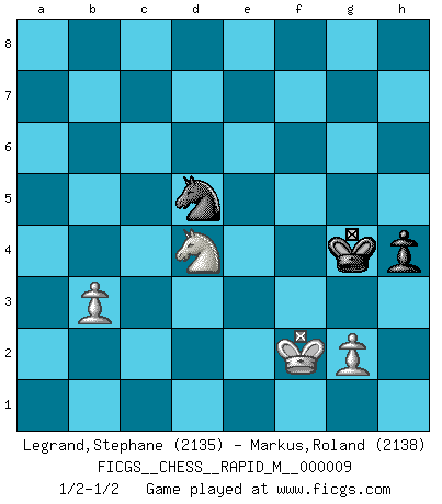 Last move : 1/2-1/2 2008 September 18 16:47:1 [Event "FICGS__CHESS__RAPID_M__000009"] [Site "FICGS"] [Date "2008.05.10"] [Round "1"] [White "Legrand,Stephane"] [Black "Markus,Roland"] [Result "1/2-1/2"] [WhiteElo "2135"] [BlackElo "2138"] 1.d4 Nf6 2.c4 e6 3.Nc3 Bb4 4.e3 b6 5.Nge2 c5 6.a3 Ba5 7.Rb1 Na6 8.Bd2 O-O 9.d5 d6 10.Nf4 e5 11.Nfe2 Bf5 12.Rc1 Bd3 13.b3 Qd7 14.Ng3 Bxf1 15.Rxf1 Bxc3 16.Bxc3 b5 17.f3 Rab8 18.e4 b4 19.axb4 cxb4 20.Bd2 g6 21.Bg5 Ne8 22.Be3 Qc7 23.f4 exf4 24.Rxf4 Nc5 25.Kf1 a5 26.Ne2 Ra8 27.Nd4 Ng7 28.Kg1 Nh5 29.Rh4 Ng7 30.Nc6 Nge6 31.Kh1 Nd8 32.Nd4 Qd7 33.Qf3 f6 34.Bh6 Rf7 35.Bd2 Rf8 36.Rb1 Nf7 37.Qxf6 Rae8 38.Rf4 Ne5 39.Qh4 Rxf4 40.Bxf4 Ned3 41.Bh6 Nxe4 42.h3 Qe7 43.Qxe7 Rxe7 44.Ra1 g5 45.Rxa5 Kf7 46.Kh2 Kg6 47.Bf8 Rf7 48.Ne6 Rf2 49.Bxd6 Nxd6 50.Ra6 Nxc4 51.Nf4+ Kf5 52.Nxd3 Rd2 53.Nxb4 Ne3 54.Ra2 Rxa2 55.Nxa2 Nxd5 56.Kg3 h5 57.Kf2 Kf4 58.Nc1 g4 59.Ne2+ Kg5 60.hxg4 Kxg4 61.Nd4 h4 1/2-1/2 Nimzo-Indian : Fischer variation Kingside Castling by player Black (move 8) 10 pieces endgame at move 55 : White KNPPPP , Black KNPP WHITE : King + 1 Knight 4 Pawns BLACK : King + 1 Knight 2 Pawns 9 pieces endgame at move 55 : White KNPPP , Black KNPP WHITE : King + 1 Knight 3 Pawns BLACK : King + 1 Knight 2 Pawns 8 pieces endgame at move 60 : White KNPPP , Black KNP WHITE : King + 1 Knight 3 Pawns BLACK : King + 1 Knight 1 Pawn 7 pieces endgame at move 60 : White KNPP , Black KNP WHITE : King + 1 Knight 2 Pawns BLACK : King + 1 Knight 1 Pawn This chess game ended in a draw. Follow this game move after move (download)Chess is thirty to forty percent psychology. You don't have this when you play a computer. I can't confuse it. (Judith Polgar) Spielt Blackmar-Diemer-Gambit, und das Matt kommt von selbst! (Emil Joseph Diemer) El jugador blanco perdió porque fallo en recordar la coreccta continuación y tuvo que pensar por sí mismo las movidas. (Siegbert Tarrasch) Pour moi, les échecs ne sont pas un jeu mais un art. (Alexandre Alekhine) The man who strikes first admits that his ideas have given out. (Chinese proverb)