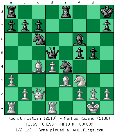 Last move : 1/2-1/2 2008 June 4 6:43:40 [Event "FICGS__CHESS__RAPID_M__000009"] [Site "FICGS"] [Date "2008.05.10"] [Round "1"] [White "Koch,Christian"] [Black "Markus,Roland"] [Result "1/2-1/2"] [WhiteElo "2210"] [BlackElo "2138"] 1.e4 e5 2.Nf3 Nf6 3.Nxe5 d6 4.Nf3 Nxe4 5.d4 d5 6.Bd3 Be7 7.O-O Nc6 8.c4 Nb4 9.Be2 O-O 10.Nc3 Be6 11.Ne5 f6 12.Nf3 f5 13.a3 Nc6 14.Qa4 Kh8 15.Nxd5 Bxd5 16.cxd5 Qxd5 17.Rd1 Bf6 18.Be3 g5 19.Bc4 Qd6 20.Qc2 Rfe8 21.Bd3 Qd5 22.Bc4 1/2-1/2 Petrov : Classical attack Kingside Castling by player White (move 7) Kingside Castling by player Black (move 9) This chess game ended in a draw. Follow this game move after move (download)The way he plays Chess demonstrates a man's whole nature. (Stanley Ellin) Wenn du gegen Bobby spielst, ist es keine Frage von gewinnen oder verlieren. Es ist eine Frage des Überlebens. (Boris Vassilievich Spassky) En posiciones complicadas, Bobby Fischer pocas veces tuvo que temer de cualquiera. (Paul Keres) On n'a jamais que l'âge auquel on a commence à jouer aux échecs car après on cesse de vieillir. (Capablanca) A journey of a thousand sites begins with a single click. (Author unknown)