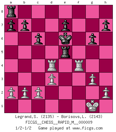 Last move : 1/2-1/2 2008 July 2 17:56:12 [Event "FICGS__CHESS__RAPID_M__000009"] [Site "FICGS"] [Date "2008.05.10"] [Round "1"] [White "Legrand,Stephane"] [Black "Borisovs,Leonids"] [Result "1/2-1/2"] [WhiteElo "2135"] [BlackElo "2143"] 1.e4 c5 2.Nf3 Nc6 3.Bb5 g6 4.O-O Bg7 5.Re1 Nf6 6.e5 Nd5 7.Nc3 Nc7 8.Bxc6 dxc6 9.Ne4 Ne6 10.d3 Qc7 11.Ng3 O-O 12.Bd2 Rd8 13.Qc1 Nd4 14.Nxd4 cxd4 15.Bf4 Be6 16.Ne4 Qb6 17.Bh6 Bxe5 18.Ng5 Rd5 19.f4 Bf6 20.Nxe6 fxe6 21.Rxe6 Qc7 22.g3 Qd7 23.Qe1 Kf7 24.Re4 Rh5 25.Bg5 Bxg5 26.fxg5 Rxg5 27.Qf2+ Rf5 28.Qxd4 Qxd4+ 29.Rxd4 Re5 30.Rf1+ Ke6 31.R1f4 1/2-1/2 Sicilian : Nimzovich-Rossolimo attack (with ...g6, without ...d6) Kingside Castling by player White (move 4) Kingside Castling by player Black (move 11) This chess game ended in a draw. Follow this game move after move (download)You can only get good at Chess if you love the game. (Bobby Fischer) Schach ist ein Reich, wo sich die menschliche Phantasie frei entfalten kann. (David Bronstein) No todos los artistas son jugadores de Ajedrez, pero todos los jugadores de Ajedrez son artistas. (Marcel Duchamp) Même si vous avez un bon coup à faire, regardez toujours s'il n'y en a pas un qui lui soit préférable. (Pedro Damiano) If only people were all showed a certain minimum level of niceness; if only people didn't retract verbal draw offers (without draw box ticked) on ficgs; if only people didn't kill; if only people didn't run concentration / extermination camps, if only people didn't drop nuclear bombs on Hiroshima and Nagasaki, and so on - it would be a much more beautiful world. But sadly, things are not so... (Normajean Yates)