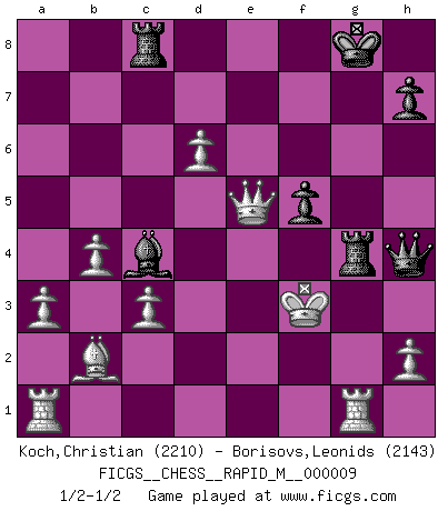 Last move : 1/2-1/2 2008 June 24 9:25:6 [Event "FICGS__CHESS__RAPID_M__000009"] [Site "FICGS"] [Date "2008.05.10"] [Round "1"] [White "Koch,Christian"] [Black "Borisovs,Leonids"] [Result "1/2-1/2"] [WhiteElo "2210"] [BlackElo "2143"] 1.e4 c5 2.Nf3 Nc6 3.d4 cxd4 4.Nxd4 e5 5.Nb5 d6 6.N1c3 a6 7.Na3 Be6 8.Nc4 b5 9.Ne3 Nf6 10.g3 b4 11.Ncd5 Nxe4 12.Bg2 f5 13.O-O Rc8 14.g4 g6 15.a3 b3 16.c3 Be7 17.Qxb3 Nc5 18.Qd1 O-O 19.b4 Ne4 20.f4 Kh8 21.Bb2 Nf6 22.gxf5 Nxd5 23.Nxd5 gxf5 24.Qe2 Bf6 25.Qxa6 Ne7 26.Nxf6 Bc4 27.Qb7 Rxf6 28.fxe5 Rf7 29.exd6 Ng6 30.Qf3 Nh4 31.Qf4 Nxg2 32.Kxg2 Rg7+ 33.Kf2 Rg4 34.Qe5+ Kg8 35.Rg1 Qh4+ 36.Kf3 1/2-1/2 Sicilian : Labourdonnais-Loewenthal (Kalashnikov) variation Kingside Castling by player White (move 13) Kingside Castling by player Black (move 18) This chess game ended in a draw. Follow this game move after move (download)Bobby Fischer's current state of mind is indeed a tragedy. One of the world's greatest Chess players - the pride and sorrow of American Chess. (Frank Brady) Ein unbeabsichtigtes Patt ist der Gipfel der Dummheit. (Anonymous) El poder defensivo de una pieza clavada, solamente es imaginario. (Aaron Nimzovich) Nous vivons dans un monde échiquéen : chaque jour qui passe est un défi à relever. (Philosophe Sasha) Art is the triumph over chaos. (John Cheever)