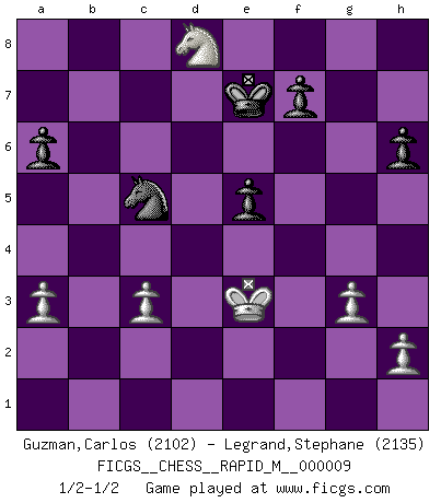 Last move : 1/2-1/2 2008 September 13 19:59:52 [Event "FICGS__CHESS__RAPID_M__000009"] [Site "FICGS"] [Date "2008.05.10"] [Round "1"] [White "Guzman,Carlos"] [Black "Legrand,Stephane"] [Result "1/2-1/2"] [WhiteElo "2102"] [BlackElo "2135"] 1.e4 c5 2.c3 Nf6 3.e5 Nd5 4.Nf3 Nc6 5.Bc4 Nb6 6.Bb3 c4 7.Bc2 Qc7 8.Qe2 g5 9.e6 dxe6 10.Nxg5 Qe5 11.d4 cxd3 12.Bxd3 Qxe2+ 13.Bxe2 h6 14.Ne4 e5 15.Nc5 e6 16.Nb3 Bd7 17.N1d2 O-O-O 18.Ne4 Be7 19.O-O Kb8 20.Rd1 Nd5 21.c4 Nf4 22.Bf1 Nb4 23.a3 Nc2 24.Bxf4 exf4 25.Rac1 Bc6 26.Nc3 Rxd1 27.Rxd1 Rd8 28.Rxd8+ Bxd8 29.Bd3 Ne1 30.Be4 Bf6 31.Kf1 Bxc3 32.Bxc6 bxc6 33.bxc3 Nd3 34.Ke2 Nb2 35.c5 e5 36.g3 fxg3 37.fxg3 Kc7 38.Kf3 Kd7 39.Na5 Na4 40.Ke4 Ke6 41.Nxc6 Nxc5+ 42.Ke3 a6 43.Nd8+ Ke7 44.Nc6+ Kd6 45.Nd8 Ke7 1/2-1/2 Sicilian : Alapin's variation (2.c3) Queenside Castling by player Black (move 17) Kingside Castling by player White (move 19) This chess game ended in a draw. Follow this game move after move (download)A good sacrifice is one that is not necessarily sound but leaves your opponent dazed and confused. (Rudolph Spielmann) Wenn ein Kopf und ein Buch zusammenstoßen und es klingt hohl, ist es denn allemal im Buche? (Georg Christoph Lichtenberg) El Ajedrez es el arte del análisis. (Mikhail Botvinnik) Les échecs sont utiles à l'exercice de la faculté de penser et à celle de l'imagination. Car nous devons posséder une méthode élaborée pour atteindre des buts partout où nous devons conduire notre raison. (Leibnitz) The various flowers seem good to different people. (Chinese proverb)
