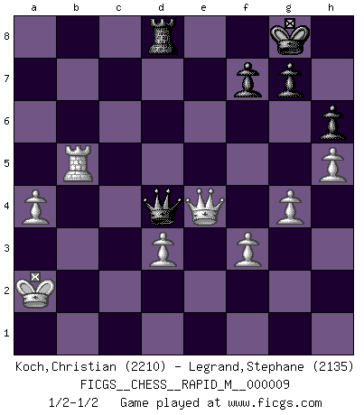 Last move : 1/2-1/2 2008 August 17 19:10:59 [Event "FICGS__CHESS__RAPID_M__000009"] [Site "FICGS"] [Date "2008.05.10"] [Round "1"] [White "Koch,Christian"] [Black "Legrand,Stephane"] [Result "1/2-1/2"] [WhiteElo "2210"] [BlackElo "2135"] 1.e4 c5 2.Nf3 d6 3.d4 cxd4 4.Nxd4 Nf6 5.Nc3 Nc6 6.Bg5 e6 7.Qd2 Be7 8.O-O-O O-O 9.f3 a6 10.h4 Nxd4 11.Qxd4 b5 12.e5 dxe5 13.Qxe5 Qb6 14.Bd3 Bb7 15.Be3 Qa5 16.h5 h6 17.Qg3 Kh8 18.Kb1 Rfd8 19.Qf2 Nd5 20.Nxd5 Bxd5 21.a3 Rab8 22.Ba7 Rb7 23.Bc5 Bxc5 24.Qxc5 Rc7 25.Qe3 Rcd7 26.Kc1 Kg8 27.Qf4 Qb6 28.Rhe1 a5 29.Qe3 Qb8 30.Qe5 Qb7 31.Rd2 Bc6 32.Red1 b4 33.Bc4 bxa3 34.bxa3 Bd5 35.Bxd5 exd5 36.Rd3 Rd6 37.Rb3 Qc6 38.Qc3 Qa6 39.Qc7 R6d7 40.Qe5 Qc6 41.R1d3 d4 42.Qxa5 Rc8 43.Qd2 Qc4 44.Kb1 Qc6 45.Rb4 Rcd8 46.g4 Rd5 47.Rdb3 Qd6 48.a4 Qg3 49.Rb5 R5d7 50.Qe2 Qg1+ 51.Ka2 d3 52.Rxd3 Rxd3 53.cxd3 Qd4 54.Qe4 1/2-1/2 Sicilian : Richter-Rauzer, Rauzer attack, 7...Be7 Queenside Castling by player White (move 8) Kingside Castling by player Black (move 8) This chess game ended in a draw. Follow this game move after move (download)Chess is a fighting game which is purely intellectual and includes chance. (Richard Reti) Lisa Lane, amerikanische Schachmeisterin, hatte Fischer einmal als stärksten lebenden Spieler bezeichnet. Antwort: Das ist richtig, aber Lisa Lane ist eigentlich nicht in der Lage, das zu beurteilen. (Robert James Fischer) Por esta medida (el intervalo entre Fischer y sus contemporaneos), yo le considero el mas grande campeón mundial. (Garry Kasparov) Le système Elo représente seulement une moyenne. Il est simplement un indicateur de votre stabilité. (Anatoli Karpov) Philosophers use a language that is already deformed as though by shoes that are too tight. (Ludwig Wittgenstein)