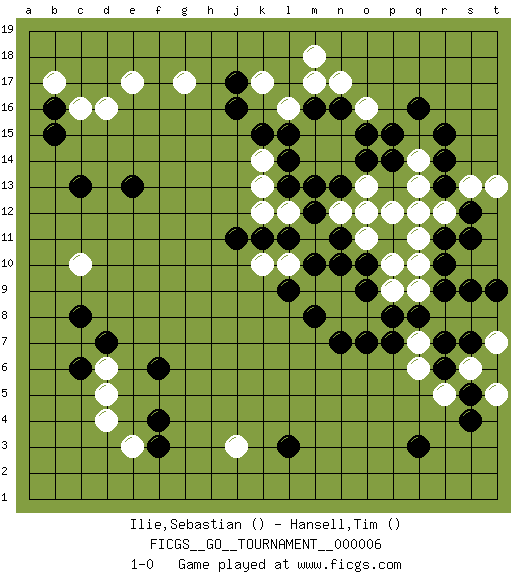 Last move : 1-0 2006 September 26 21:58:49 [Event "FICGS__GO__TOURNAMENT__000006"] [Site "FICGS"] [Date "2006.07.18"] [Round "1"] [Black "Ilie,Sebastian"] [White "Hansell,Tim"] [Result "1-0"] 1.q16 d4 2.q3 d16 3.r9 q9 4.q8 q10 5.r10 q11 6.r11 q12 7.p8 p9 8.o9 p12 9.n11 r12 10.s12 s13 11.s11 r8 12.r7 t13 13.r14 o8 14.o10 s8 15.s7 q7 16.p7 q6 17.o7 n8 18.n7 t7 19.s9 t8 20.t6 c10 21.f3 s6 22.t9 n9 23.n13 o11 24.n10 n12 25.m12 g17 26.c6 d6 27.d7 m11 28.m10 d5 29.c8 l10 30.l11 o12 31.r13 p10 32.m8 m9 33.l9 q13 34.o14 q14 35.r15 k10 36.p15 k17 37.f6 m17 38.c13 o13 39.p14 n14 40.m13 m18 41.b16 c16 42.b15 b17 43.e13 l12 44.k11 m14 45.l13 k12 46.j11 k13 47.l14 k14 48.l15 m15 49.m16 n15 50.n16 l16 51.k15 o16 52.o15 j3 53.l3 e17 54.j16 t7 55.r6 t5 56.s4 n17 57.j17 r5 58.s5 e3 59.f4 1-0 Here are the names of the openings (joseki) played in the four corners : Corner q16 : q16 q11 Hoshi (Hwajeom, Seongjeom, Xingwei`) 4-4 Point. The star or hoshi (4-4) point, emphasizing influence at the potential expense of territory. Corner d4 : d4 f3 Hoshi (Hwajeom, Seongjeom, Xingwei`) 4-4 Point. The star or hoshi (4-4) point, emphasizing influence at the potential expense of territory. Ikken Kakari (Hankan Keolch'im, Yi Gua`jiao~, 1-Space Low Approach). Black 2 is the standard approach move to the 4-4. Player Black won this Go (weiqi, baduk) game. Follow this game move after move (download)If there is no stone on the handicap point, the carpenter's square is dead. (Anonymous) There is no instance of a country having benefited from prolonged warfare. (Sun Tzu)