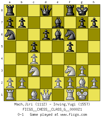 Last move : 0-1 2008 July 8 0:40:6 [Event "FICGS__CHESS__CLASS_G__000021"] [Site "FICGS"] [Date "2008.05.12"] [Round "1"] [White "Mach,Jiri"] [Black "Inving,Yugi"] [Result "0-1"] [WhiteElo "1112"] [BlackElo "1557"] 1.d4 f5 2.Nf3 Nf6 3.c4 Na6 4.Nc3 e6 5.g3 Be7 6.Bg2 O-O 7.O-O c5 8.d5 d6 9.dxe6 Bxe6 0-1 Dutch Kingside Castling by player Black (move 6) Kingside Castling by player White (move 7) Player Black won this chess game. Follow this game move after move (download)We don't really know how the game was invented, though there are suspicions. As soon as we discover the culprits, we'll let you know. (Bruce Pandolfini) Rauchen ist dem Schachspieler bei seiner Arbeit, also im Wettkampf, untersagt. (Viktor Kortschnoi) La última cosa en que Fischer estaba interesado era en tonterías, siempre y cuando el Ajedrez estuviera involucrado. (Elie Agur) Si rien de grave n'est détecté lors de l'analyse d'une position, on joue alors le coup. Seconde règle de Blumenfeld. Everything in life is luck. (Donald Trump)
