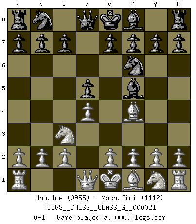 Last move : 0-1 2008 June 30 1:52:35 [Event "FICGS__CHESS__CLASS_G__000021"] [Site "FICGS"] [Date "2008.05.12"] [Round "1"] [White "Uno,Joe"] [Black "Mach,Jiri"] [Result "0-1"] [WhiteElo "0955"] [BlackElo "1112"] 1.d4 Nf6 2.Nc3 d5 3.Bf4 Bf5 0-1 This chess game has been lost on time (started : 2008.05.12 10:0:12) Queen's pawn game Player Black won this chess game. Follow this game move after move (download)Different people feel differently about resigning. (Bobby Fischer) Warum muß ich gegen diesen IDIOTEN verlieren? (Aaron Nimzowitsch) La estratégia requiere pensar, la táctica requiere observación. (Max Euwe) Même si vous avez un bon coup à faire, regardez toujours s'il n'y en a pas un qui lui soit préférable. (Pedro Damiano) Inventor: A person who makes an ingenious arrangement of wheels, levers and springs, and believes it civilization. (Ambrose Bierce, The Devil's Dictionary)