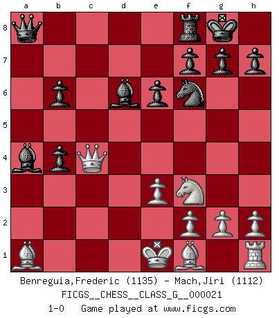 Last move : 1-0 2008 September 14 1:47:24 [Event "FICGS__CHESS__CLASS_G__000021"] [Site "FICGS"] [Date "2008.05.12"] [Round "1"] [White "Benreguia,Frederic"] [Black "Mach,Jiri"] [Result "1-0"] [WhiteElo "1135"] [BlackElo "1112"] 1.Nf3 Nf6 2.d4 d5 3.b4 e6 4.a3 a5 5.Bb2 axb4 6.axb4 Rxa1 7.Bxa1 Bxb4+ 8.c3 Bd6 9.Qa4+ Bd7 10.Qa7 b6 11.Na3 O-O 12.e3 Nc6 13.Qa4 Nxd4 14.Qxd4 Qa8 15.Nc2 Ba4 16.Nb4 c5 17.Qd3 cxb4 18.c4 dxc4 19.Qxc4 1-0 This chess game has been lost on time (started : 2008.05.12 10:0:12) Reti Opening Kingside Castling by player Black (move 11) Player White won this chess game. Follow this game move after move (download)Different people feel differently about resigning. (Bobby Fischer) Um sich vor der Gefahr einer Erkältung zu schützen, sorge der wanderlustige König beizeiten für ein brauchbares Versteck. (Aaron Nimzowitsch) El ganador de una partida es aquel jugador que hace el penúltimo error. (Savielly Tartakover) Le système Elo représente seulement une moyenne. Il est simplement un indicateur de votre stabilité. (Anatoli Karpov) Pretend inferiority and encourage his arrogance. (Sun Tzu)