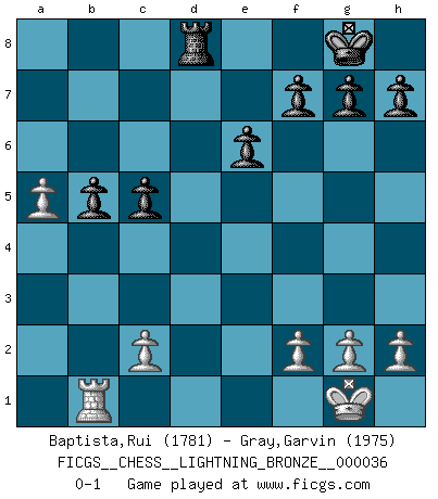 Last move : 0-1 2008 May 13 18:17:7 [Event "FICGS__CHESS__LIGHTNING_BRONZE__000036"] [Site "FICGS"] [Date "2008.05.13"] [Round "1"] [White "Baptista,Rui"] [Black "Gray,Garvin"] [Result "0-1"] [WhiteElo "1781"] [BlackElo "1975"] 1.e4 c5 2.Nf3 d6 3.Nc3 Nf6 4.Bc4 e6 5.d4 cxd4 6.Nxd4 a6 7.O-O Be7 8.Bg5 O-O 9.a4 Nc6 10.Nxc6 bxc6 11.Re1 d5 12.Bb3 d4 13.e5 dxc3 14.exf6 Bxf6 15.Qxd8 Bxd8 16.Bxd8 cxb2 17.Rad1 b1Q 18.Rxb1 Rxd8 19.Red1 Bd7 20.a5 c5 21.Bc4 Bb5 22.Rxd8+ Rxd8 23.Bxb5 axb5 0-1 This chess game has been lost on time (started : 2008.05.13 15:29:29) Comment by player 1 : Rui Baptista : sorry for that computer froze could not get back in.good game thou Comment by player 2 : Garvin Gray : Are you still playing Rui? Sicilian Kingside Castling by player White (move 7) Kingside Castling by player Black (move 8) Promotion Queen by player Black (move 17) Player Black won this chess game. Follow this game move after move (download)Chess is as much a mystery as women. (Purdy) Modernes Schach erfordert enorme Anspannung. Es ist für einen normalen Menschen unmöglich das auszuhalten. (Viktor Kortschnoi) Tu sabes que vas a perder. Aún cuando tenía la ventaja, yo sabía que iba a perder. - al estar jugando con Fischer (Andrew Soltis) Toute estimation doit être constamment réévaluée. (Jacob Estrin) In theory there is no difference between theory and practice. In practice there is. (Yogi Berra)