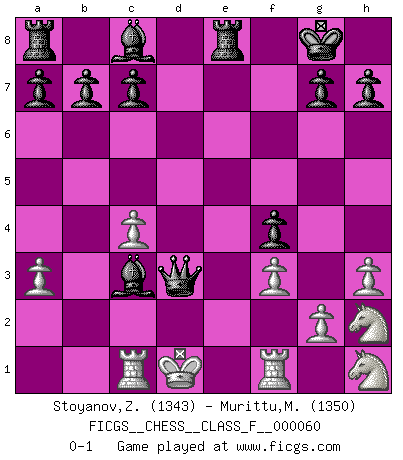 Last move : 0-1 2008 May 30 17:53:50 [Event "FICGS__CHESS__CLASS_F__000060"] [Site "FICGS"] [Date "2008.05.14"] [Round "1"] [White "Stoyanov,Zdravko"] [Black "Murittu,Massimiliano"] [Result "0-1"] [WhiteElo "1343"] [BlackElo "1350"] 1.e4 Nf6 2.d3 e5 3.Nf3 Nc6 4.a3 d5 5.Nbd2 Be7 6.h3 O-O 7.Be2 Qd7 8.exd5 Nxd5 9.O-O Qf5 10.Ne4 Qg6 11.Ng3 f5 12.c4 Nf4 13.Nh2 Nxe2+ 14.Qxe2 f4 15.Nh1 Nd4 16.Qxe5 Bf6 17.Qe4 Qxe4 18.f3 Ne2+ 19.Kf2 Qd4+ 20.Ke1 Nxc1 21.Rxc1 Re8+ 22.Kd2 Qxb2+ 23.Rc2 Bc3+ 24.Kd1 Qb1+ 25.Rc1 Qxd3+ 0-1 Alekhine's defense : Maroczy variation Kingside Castling by player Black (move 6) Kingside Castling by player White (move 9) Player Black won this chess game. Follow this game move after move (download)The game of chess is the touchstone of the intellect. (Goethe) Nie in meinem Leben habe ich die französische Verteidigung gespielt, welche die Stumpfsinnigste von allen ist. (Wilhelm Steinitz) No solamente yo pronostico su triunfo sobre Botvinnik, sino que me adelanto y digo que probablemente Fischer es el jugador de Ajedrez mas grande que haya existido. (John Collins) Avec des compensations pour le matériel en plus... (Anonyme) The best weapon against an enemy is another enemy. (Friedrich Nietzsche)