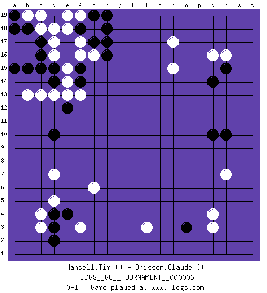 Last move : 0-1 2006 August 2 19:12:13 [Event "FICGS__GO__TOURNAMENT__000006"] [Site "FICGS"] [Date "2006.07.18"] [Round "1"] [Black "Hansell,Tim"] [White "Brisson,Claude"] [Result "0-1"] 1.d10 q4 2.d4 d16 3.e16 d17 4.d15 e15 5.f15 e14 6.c15 f16 7.e17 f17 8.e18 d18 9.f18 g18 10.g17 g16 11.h17 f19 12.b15 q16 13.a15 c13 14.h18 e19 15.h16 n17 16.c16 f3 17.c17 c18 18.q10 d7 19.q14 c3 20.r15 r16 21.b18 b19 22.a18 b13 23.a19 c19 24.d14 d13 25.h19 l3 26.f14 f13 27.g19 r7 28.f18 e18 29.e12 e13 30.r10 n15 31.o3 q3 32.d3 c4 33.d2 d5 34.e4 g6 0-1 Here are the names of the openings (joseki) played in the four corners : Corner d16 : d16 e16 Hoshi (Hwajeom, Seongjeom, Xingwei`) 4-4 Point. The star or hoshi (4-4) point, emphasizing influence at the potential expense of territory. Corner d4 : d4 f3 Hoshi (Hwajeom, Seongjeom, Xingwei`) 4-4 Point. The star or hoshi (4-4) point, emphasizing influence at the potential expense of territory. Ikken Kakari (Hankan Keolch'im, Yi Gua`jiao~, 1-Space Low Approach). White 2 is the standard approach move to the 4-4. Player White won this Go (weiqi, baduk) game. Follow this game move after move (download)Don't make a play adjacent to a cutting-point. (Anonymous) Don't be irreplaceable, if you can't be replaced, you can't be promoted. (Dan Rotaru)