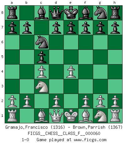 Last move : 1-0 2008 June 25 1:20:38 [Event "FICGS__CHESS__CLASS_F__000060"] [Site "FICGS"] [Date "2008.05.14"] [Round "1"] [White "Gramajo,Francisco"] [Black "Brown,Parrish"] [Result "1-0"] [WhiteElo "1316"] [BlackElo "1367"] 1.e4 c5 2.c4 Nc6 3.Nc3 1-0 This chess game has been lost on time (started : 2008.05.14 19:37:31) Sicilian defense Player White won this chess game. Follow this game move after move (download)Chess mastery essentially consists of analyzing Chess positions accurately. (Mikhail Botvinnik) Meine Liebe ist Schach, Schach, Schach. Ich muss jeden Tag Schach spielen, deshalb fühle ich mich so stark. (Miguel Najdorf) Cuando veas una buena jugada, trata de encontrar otra mejor. (Emanuel Lasker) L'attaque fait le spectacle, la défense gagne les matchs. (Dicton footballistique) Man with more than one clock never knows what time it is. (Chinese thought)