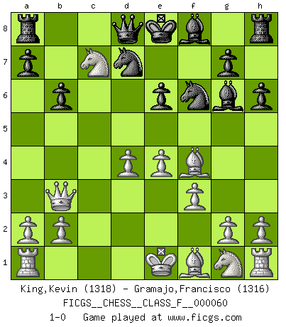 Last move : 1-0 2008 June 4 6:24:12 [Event "FICGS__CHESS__CLASS_F__000060"] [Site "FICGS"] [Date "2008.05.14"] [Round "1"] [White "King,Kevin"] [Black "Gramajo,Francisco"] [Result "1-0"] [WhiteElo "1318"] [BlackElo "1316"] 1.d4 d5 2.c4 Nf6 3.Nc3 Bg4 4.Qb3 b6 5.cxd5 h6 6.Bf4 Nbd7 7.f3 Bf5 8.e4 Bg6 9.Nb5 e5 10.dxe6 fxe6 11.Nxc7+ 1-0 QGD : Marshall defense Player White won this chess game. Follow this game move after move (download)If cunning alone were needed to excel, women would be the best Chess players. (Albin) Zeige mir drei Eröffnungsvarianten und ich beweise dir, dass zwei davon inkorrekt sind. (Emanuel Lasker) Después de una mala apertura, hay una esperanza en el juego medio. Pero una vez que estas en finales, el momento de la verdad ha llegado. (Edmar Mednis) Assurément je connaissais par expérience le mystérieux attrait de ce jeu royal, le seul entre tous les jeux inventés par les hommes qui échappe souverainement à la tyrannie du hasard, le seul où l'on ne doive sa victoire qu'à son intelligence ou plutôt à une certaine forme d'intelligence. Mais n'est-ce pas déjà le limiter injurieusement que d'appeler les échecs un jeu ? N'est-ce pas une science, un art ou quelque chose qui, comme le cercueil de Mahomet entre ciel et terre, est suspendu entre l'un et l'autre, et qui réunit un nombre incroyable de contraires ? [...] C'est une pensée qui ne mène à rien, une mathématique qui n'établit rien, un art qui ne laisse pas d'uvre, une architecture sans matière; et il l'a prouvé néanmoins qu'il était plus durable, à sa manière, que les livres ou que tout autre monument, ce jeu unique qui appartient à tous les peuples et à tous les temps, et dont personne ne sait quel dieu en fit don à la terre pour tuer l'ennui, pour aiguiser l'esprit et stimuler l'âme. Où commence-t-il, où finit-il ? (Stefan Zweig) A journey of a thousand sites begins with a single click. (Author unknown)