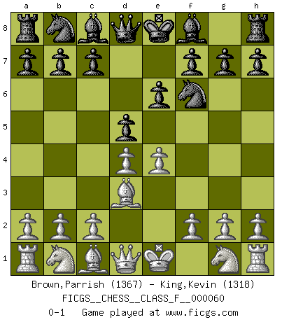 Last move : 0-1 2008 June 24 13:17:13 [Event "FICGS__CHESS__CLASS_F__000060"] [Site "FICGS"] [Date "2008.05.14"] [Round "1"] [White "Brown,Parrish"] [Black "King,Kevin"] [Result "0-1"] [WhiteElo "1367"] [BlackElo "1318"] 1.e4 e6 2.d4 d5 3.Bd3 Nf6 0-1 This chess game has been lost on time (started : 2008.05.14 19:37:31) French : Schlechter variation Player Black won this chess game. Follow this game move after move (download)I have always a slight feeling of pity for the man who has no knowledge of Chess. (Siegbert Tarrasch) Kasparov ist eine Art Monster mit hundert Augen, denen auch nicht das Geringste entgeht. (Tony Miles) Cuando la partida de Ajedrez termina, el Peón y el Rey regresan a la misma caja. (Irish saying) Psychologiquement, tu dois avoir confiance en toi même, mais cette confiance doit être basée sur des faits. (Robert Fischer) Perhaps chess is the wrong game for the times (The Chess Master and the Computer, by Garry Kasparov - 2010)