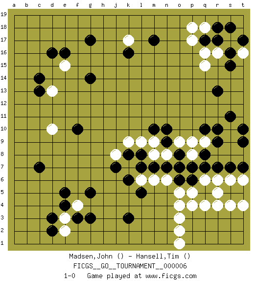 Last move : 1-0 2006 September 26 20:31:6 [Event "FICGS__GO__TOURNAMENT__000006"] [Site "FICGS"] [Date "2006.07.18"] [Round "1"] [Black "Madsen,John"] [White "Hansell,Tim"] [Result "1-0"] 1.d16 q4 2.d3 q15 3.r17 q16 4.q17 p17 5.s15 r4 6.r13 o2 7.g3 r16 8.s16 o4 9.r10 f4 10.f3 e3 11.e4 s17 12.s18 e2 13.d2 e15 14.e16 d10 15.e5 k17 16.g17 t4 17.r7 o1 18.c14 s4 19.k3 o3 20.c7 p4 21.g14 r8 22.q8 q18 23.r18 p18 24.m17 r6 25.q7 r5 26.g5 t16 27.t17 q9 28.r9 s8 29.s7 t8 30.t7 s9 31.q10 p9 32.f10 p8 33.p6 s6 34.k16 t6 35.l5 q6 36.p7 d13 37.c13 o7 38.o6 s10 39.s11 n6 40.t10 pass 41.o8 o5 42.n7 p5 43.o7 n8 44.m7 o9 45.n9 m8 46.n10 m6 47.l7 l6 48.l8 m9 49.m10 l9 50.k6 k7 51.k8 k9 52.j7 j8 53.t9 1-0 Here are the names of the openings (joseki) played in the four corners : Corner q16 : q15 r17 Takamoku (Gomok, Gaomu`) 5-4 Point. The takamoku (high) point (5-4). With its emphasis on influence, the 5-4 point complements the 4-4 (hoshi) point in creating an influence-oriented fuseki. San-san. Black plays the 3-3 when White has a stone at top such as marked. Corner d16 : d16 e15 Hoshi (Hwajeom, Seongjeom, Xingwei`) 4-4 Point. The star or hoshi (4-4) point, emphasizing influence at the potential expense of territory. Player Black won this Go (weiqi, baduk) game. Follow this game move after move (download)Be a little patient. Keshi works ! (Anonymous) Question: Is 'This statement is paradoxical' a paradoxical statement ? Or is it a meta-paradox ? (Normajean Yates)
