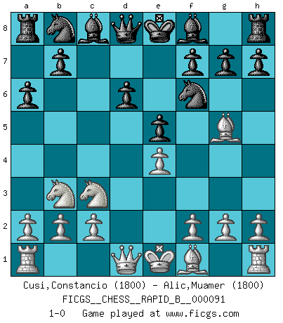 Last move : 1-0 2008 July 13 14:55:47 [Event "FICGS__CHESS__RAPID_B__000091"] [Site "FICGS"] [Date "2008.05.15"] [Round "1"] [White "Cusi,Constancio"] [Black "Alic,Muamer"] [Result "1-0"] [WhiteElo "1800"] [BlackElo "1800"] 1.e4 c5 2.Nf3 d6 3.d4 cxd4 4.Nxd4 Nf6 5.Nc3 a6 6.Bg5 e5 7.Nb3 1-0 This chess game has been lost on time (started : 2008.05.15 22:57:11) Sicilian : Najdorf, 6.Bg5 Player White won this chess game. Follow this game move after move (download)If Chess is a science, it's a most inexact one. If Chess is an art, it is too exacting to be seen as one. If Chess is a sport, it's too esoteric. If Chess is a game, it's too demanding to be just a game. If Chess is a mistress, she's a demanding one. If Chess is a passion, it's a rewarding one. If Chess is life, it's a sad one. (Unknown) Ohne ihre Erfolge schmälern zu wollen würde ich sagen Petrosian, Spassky und Karpov verdanken ihre Siege ihren Trainern - Boleslavsky, Bondarevsky und Furman. (Mikhail Moiseyevich Botvinik) Del Ajedrez se ha dicho que la vida no es lo suficientemente larga para él, pero eso es culpa de la vida, no del Ajedrez. (William Ewart Napier) Roi des jeux et jeu des rois, les échecs portent en eux un sentiment d'infini. Ils donnent à celui qui s'est efforcé d'en approfondir les arcanes l'impression de n'être pas à la mesure de l'homme; en fait, ils constituent un résumé de l'univers, un microcosme, et figurent cette grande échelle qui, dans les plans de la lumière descend jusqu'à la matière, qui des abîmes insondables remonte jusqu'en l'infini de Dieu. (Pyrame) There are three kinds of lies: lies, damned lies and statistics. (Mark Twain)