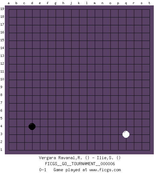 Last move : 0-1 2006 August 1 23:0:4 [Event "FICGS__GO__TOURNAMENT__000006"] [Site "FICGS"] [Date "2006.07.18"] [Round "1"] [Black "Vergara Ravanal,Raul Andres"] [White "Ilie,Sebastian"] [Result "0-1"] 1.d4 q3 0-1 Here are the names of the openings (joseki) played in the four corners : Corner q4 : q3 0-1 Komoku (Somok, Xiao~mu`) 3-4 Point. The komoku (3-4) point is the traditional corner enclosure move.. Player White won this Go (weiqi, baduk) game. Follow this game move after move (download)The rectangular six is normally alive. (Anonymous) Horse racing is animated roulette. (Roger Kahn)
