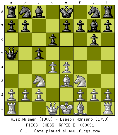 Last move : 0-1 2008 June 29 13:45:24 [Event "FICGS__CHESS__RAPID_B__000091"] [Site "FICGS"] [Date "2008.05.15"] [Round "1"] [White "Alic,Muamer"] [Black "Biason,Adriano"] [Result "0-1"] [WhiteElo "1800"] [BlackElo "1738"] 1.e4 c5 2.Nf3 Qa5 3.Nc3 g6 4.d4 d6 5.Be3 Bg7 0-1 This chess game has been lost on time (started : 2008.05.15 22:57:11) Sicilian : Stiletto (Althouse) variation Player Black won this chess game. Follow this game move after move (download)Chess holds its master in its own bonds, shackling the mind and brain so that the inner freedom of the very strongest must suffer. (Albert Einstein) Ein Isolani verdüstert die Stimmung auf dem ganzen Schachbrett. (Savielly Grigorievitsch Tartakower) No hay un Gran Maestro de Ajedrez que sea normal; solo se diferencían ellos por la magnitud de su locura. (Viktor Korchnoi) Le jeu d'échecs est comme rejeté hors du temps. (Antoine de Saint-Exupéry) Life is pain my dear and anyone who says otherwise is selling something. (Princess Bride)