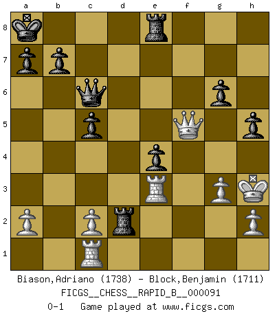 Last move : 0-1 2008 August 24 7:8:56 [Event "FICGS__CHESS__RAPID_B__000091"] [Site "FICGS"] [Date "2008.05.15"] [Round "1"] [White "Biason,Adriano"] [Black "Block,Benjamin"] [Result "0-1"] [WhiteElo "1738"] [BlackElo "1711"] 1.e4 c5 2.f4 d5 3.Nf3 dxe4 4.Ng5 Nf6 5.Nc3 Nc6 6.Bb5 Bf5 7.Qe2 Qb6 8.O-O h6 9.Nh3 O-O-O 10.Bxc6 Qxc6 11.Nf2 e6 12.Re1 Bd6 13.g3 e5 14.fxe5 Bxe5 15.Ncxe4 Nxe4 16.Nxe4 Bd4+ 17.Kg2 Rhe8 18.d3 Bxe4+ 19.dxe4 f5 20.Qf3 fxe4 21.Qg4+ Kb8 22.Bf4+ Ka8 23.Be3 Bxb2 24.Rab1 Bd4 25.Rbc1 Bxe3 26.Rxe3 Rd2+ 27.Kh3 h5 28.Qf5 g6 0-1 This chess game has been lost on time (started : 2008.05.15 22:57:11) Sicilian : Grand Prix attack Kingside Castling by player White (move 8) Queenside Castling by player Black (move 9) Player Black won this chess game. Follow this game move after move (download)A good sacrifice is one that is not necessarily sound but leaves your opponent dazed and confused. (Rudolph Spielmann) Frage des Reporters: -Welche besonderen Umstände rechtfertigen das Anhalten der Uhren während einer Turnierpartie? Antwort: -Einen Fotographen zu strangulieren. (Siegbert Tarrasch) La captura del Rey enemigo es la finalidad pero no el primer objetivo de la partida. (William Steinitz) La guerre est enfant de la passion, la passion est enfant du narcissisme et le narcissisme est l'enfant. (...) Une autre partie ? (Thibault de Vassal) War is the child of passion, passion is the child of narcissism and narcissism is the child. (...) Another game ? (Thibault de Vassal)