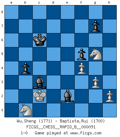Last move : 1-0 2008 August 14 18:5:23 [Event "FICGS__CHESS__RAPID_B__000091"] [Site "FICGS"] [Date "2008.05.15"] [Round "1"] [White "Wu,Sheng"] [Black "Baptista,Rui"] [Result "1-0"] [WhiteElo "1771"] [BlackElo "1700"] 1.d4 Nf6 2.c4 e6 3.Nf3 d5 4.g3 c5 5.cxd5 cxd4 6.dxe6 Bxe6 7.Qxd4 Nc6 8.Qxd8+ Rxd8 9.a3 Bd5 10.Bg2 Nd4 11.Nxd4 Bxg2 12.Rg1 Bh3 13.Be3 Ng4 14.Nc2 Nxe3 15.Nxe3 Be6 16.Nc3 Bc5 17.Rd1 Rxd1+ 18.Kxd1 Ke7 19.Kc2 Rd8 20.Rd1 Rxd1 21.Ncxd1 Kd7 22.Kd3 b5 23.Nc3 Kc6 24.Ne4 Be7 25.f4 a5 26.Ng5 Ba2 27.Nc2 Bc4+ 28.Kd2 Bf6 29.b4 axb4 30.Nxh7 Bc3+ 31.Kc1 bxa3 32.Nxa3 Bxe2 33.Ng5 f5 34.Kc2 b4 35.Nb1 1-0 This chess game has been lost on time (started : 2008.05.15 22:57:11) Queen's pawn game Player White won this chess game. Follow this game move after move (download)The blunders are all there on the board, waiting to be made. (Savielly Tartakover) Schach ist die gewalttätigste aller Sportarten. (Garry Kasparov) El Ajedrez moderno está demasiado preocupado con cosas como la estructura de Peones. Olvidenlo, el Jaque Mate termina la partida. (Nigel Short) Donnez-moi un Cavalier en 6e et je gagnerais toutes mes parties. (Steinitz) Never was anything great achieved without danger. (Niccolo Machiavelli)