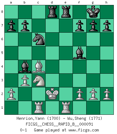 Last move : 0-1 2008 June 18 8:37:6 [Event "FICGS__CHESS__RAPID_B__000091"] [Site "FICGS"] [Date "2008.05.15"] [Round "1"] [White "Henrion,Yann"] [Black "Wu,Sheng"] [Result "0-1"] [WhiteElo "1700"] [BlackElo "1771"] 1.c4 Nf6 2.d4 e6 3.Nc3 Bb4 4.Bd2 d5 5.b3 c5 6.e3 cxd4 7.exd4 Nc6 8.Nf3 Ne4 9.Qc2 Nxd2 10.Qxd2 O-O 11.Be2 dxc4 12.Bxc4 e5 13.Rd1 exd4 14.Nxd4 Qxd4 15.Rc1 Re8+ 16.Kd1 Qxd2+ 17.Kxd2 Bf5 18.Rhe1 Rad8+ 0-1 English, 1...Nf6 (Anglo-Indian defense) Kingside Castling by player Black (move 10) Player Black won this chess game. Follow this game move after move (download)I play correspondence chess because it is both art and science while chess is art only. (A player at FICGS) Ich spiele 70 Eröffnungssysteme. (Viktor Kortschnoi) Yo adoro todas la posiciones. Denme una partida posicional difícil, y la jugaré. Pero posiciones totalmente ganadas, no las tolero. (Hein Donner) Dans le domaine de la peinture, de la gravure et de la sculpture, dès la première décennie de notre siècle, les artistes abandonnent la représentation de la partie d'échecs pour se concentrer sur les pièces, sur les échiquiers et sur toutes les variations auxquelles les unes et les autres peuvent donner lieu. On passe en quelque sorte d'un thème social à un thème musical (au sens de la musica médiévale, c'est-à-dire d'une notion qui inclue le rythme, l'harmonie, la construction et la déconstruction, etc.). Graphiquement et picturalement, l'échiquier apparaît comme une structure ouverte, dynamique, d'une richesse infinie, autorisant toutes les combinatoires et débouchant sur des mouvements et des rythmes de nature exponentielle. (Michel Pastoureau) Mac users swear by their computers. PC users swear at their computers. (Author unknown)