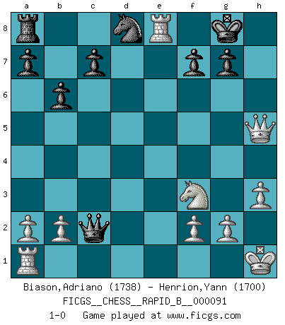 Last move : 1-0 2008 June 30 8:30:51 [Event "FICGS__CHESS__RAPID_B__000091"] [Site "FICGS"] [Date "2008.05.15"] [Round "1"] [White "Biason,Adriano"] [Black "Henrion,Yann"] [Result "1-0"] [WhiteElo "1738"] [BlackElo "1700"] 1.e4 e5 2.Qh5 d6 3.Bc4 Qe7 4.d3 Nf6 5.Qe2 Be6 6.Bxe6 Qxe6 7.Nc3 Nc6 8.Nf3 Be7 9.O-O O-O 10.Bg5 Rfe8 11.h3 h6 12.Be3 d5 13.exd5 Nxd5 14.Nxd5 Qxd5 15.Kh1 e4 16.dxe4 Qxe4 17.Qb5 Nd8 18.Qxe8+ Kh7 19.Rfe1 b6 20.Bxh6 Qxc2 21.Qxe7 Kxh6 22.Qg5+ Kh7 23.Qh5+ Kg8 24.Re8+ 1-0 Variation Patzer Opening : Patzer Opening Kingside Castling by player White (move 9) Kingside Castling by player Black (move 9) Player White won this chess game. Follow this game move after move (download)Chess is like war on a board. (Bobby Fischer) Ich kämpfe solange mein Gegner einen Fehler machen kann. (Emanuel Lasker) El Ajedrez es el gimnasio de la mente. (Blaise Pascal) Horreur, mais aussi harmonie suprême : qu'y avait-il en effet au monde en dehors des échecs ? Le brouillard, l'inconnu, le non-être... (Vladimir Nabokov) The arrogant army will lose certainly the battle. (Chinese proverb)