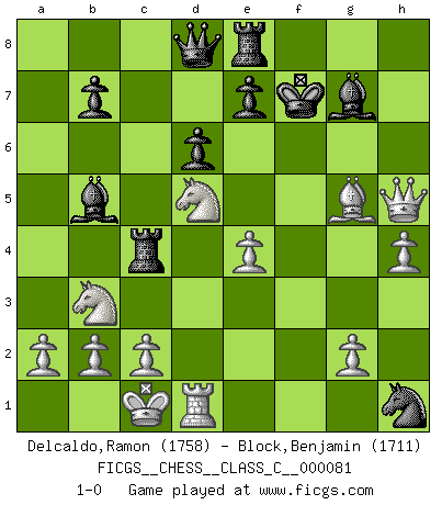 Last move : 1-0 2008 June 3 18:40:50 [Event "FICGS__CHESS__CLASS_C__000081"] [Site "FICGS"] [Date "2008.05.16"] [Round "1"] [White "Delcaldo,Ramon"] [Black "Block,Benjamin"] [Result "1-0"] [WhiteElo "1758"] [BlackElo "1711"] 1.e4 c5 2.Nf3 d6 3.d4 cxd4 4.Nxd4 Nf6 5.Nc3 g6 6.Be3 Bg7 7.f3 Nc6 8.Qd2 O-O 9.Bc4 Bd7 10.O-O-O Rc8 11.Bb3 Ne5 12.h4 h5 13.Bg5 Rc5 14.f4 Nc4 15.Qd3 Ng4 16.Nd5 Re8 17.Bxc4 Nf2 18.Qd2 Nxh1 19.Bb3 a5 20.f5 a4 21.fxg6 axb3 22.gxf7+ Kxf7 23.Nxb3 Rc4 24.Qe2 Bb5 25.Qxh5+ 1-0 Sicilian : Dragon, Yugoslav attack Kingside Castling by player Black (move 8) Queenside Castling by player White (move 10) Player White won this chess game. Follow this game move after move (download)Different people feel differently about resigning. (Bobby Fischer) Nach Morphy wurde nichts neues mehr in der Behandlung offener Positionen gefunden. (Mikhail Moiseyevich Botvinik) Aún el Rey más flojo huye despavorido ante la amenaza de un Jaque doble. (Aaron Nimzowitsch) Il s'avisa de me proposer d'apprendre les échecs qu'il jouait un peu... me voilà forcené des échecs. J'achète un échiquier, je m'enferme dans ma chambre, j'y passe des jours et des nuits à vouloir apprendre par cur toutes les parties. (Jean-Jacques Rousseau, Confessions) Indecision is the key to flexibility. (Unknown)