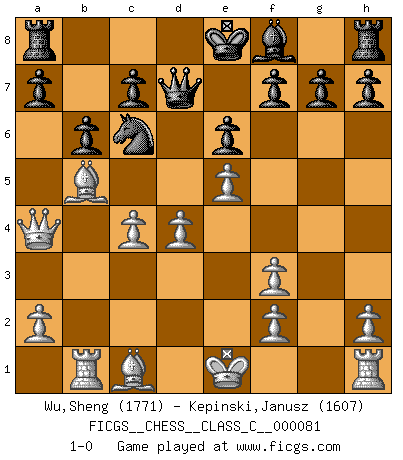 Last move : 1-0 2008 June 13 21:21:5 [Event "FICGS__CHESS__CLASS_C__000081"] [Site "FICGS"] [Date "2008.05.16"] [Round "1"] [White "Wu,Sheng"] [Black "Kepinski,Janusz"] [Result "1-0"] [WhiteElo "1771"] [BlackElo "1607"] 1.d4 d5 2.c4 Nc6 3.Nf3 Nf6 4.Nc3 Bg4 5.cxd5 Nxd5 6.e4 Bxf3 7.gxf3 Nxc3 8.bxc3 e6 9.Rb1 b6 10.Bb5 Qd6 11.e5 Qd5 12.c4 Qd7 13.Qa4 1-0 QGD : Chigorin defense Player White won this chess game. Follow this game move after move (download)The boy (then a 12 year old boy named Anatoly Karpov) doesn't have a clue about Chess, and there's no future at all for him in this profession. (Mikhail Botvinnik) Im Internet Chess Club betrug mein Rating vorübergehend 3350 ELO-Punkte. (Sergej Karjakin) El pensamiento metódico es mas útil en el Ajedrez que la inspiración. (C. J. S. Purdy) Lorsque vous vous retrouvez devant une position atroce, ne tendez pas un ultime piège dérisoire avec l'intention d'abandonner si l'adversaire le déjoue ! Faites-vous plutôt un devoir de résister comme si votre vie en dépendait. Jouez le coup qui vous déplairait au centuple si vous étiez dans la peau de votre tortionnaire ! Fear is the path to the dark side. Fear leads to anger; anger leads to hate; hate leads to suffering. I sense much fear in you. (Master Yoda in Star Wars ep.1)