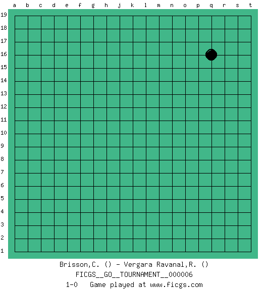 Last move : 1-0 2006 August 1 23:0:49 [Event "FICGS__GO__TOURNAMENT__000006"] [Site "FICGS"] [Date "2006.07.18"] [Round "1"] [Black "Brisson,Claude"] [White "Vergara Ravanal,Raul Andres"] [Result "1-0"] 1.q16 1-0 Here are the names of the openings (joseki) played in the four corners : Player Black won this Go (weiqi, baduk) game. Follow this game move after move (download)The L-group is dead. (Anonymous) Knowledge rests not upon truth alone, but upon error also. (Carl G. Jung)