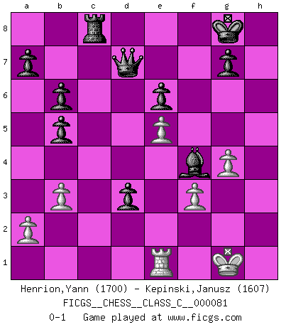 Last move : 0-1 2008 August 4 8:39:12 [Event "FICGS__CHESS__CLASS_C__000081"] [Site "FICGS"] [Date "2008.05.16"] [Round "1"] [White "Henrion,Yann"] [Black "Kepinski,Janusz"] [Result "0-1"] [WhiteElo "1700"] [BlackElo "1607"] 1.e4 e6 2.d4 d5 3.e5 b6 4.Nf3 Ne7 5.Bg5 Qd7 6.Nc3 h6 7.Bb5 c6 8.Ba4 hxg5 9.Nxg5 Nf5 10.O-O Be7 11.Qf3 Bxg5 12.b4 O-O 13.b5 Nxd4 14.Qd1 Nxb5 15.Nxb5 cxb5 16.Bb3 Na6 17.Qg4 f6 18.Rfe1 Nc5 19.Rad1 Nxb3 20.cxb3 Bb7 21.f4 Bh6 22.Rd3 fxe5 23.fxe5 Rac8 24.Rg3 d4 25.Rd1 Bf4 26.Rf3 Bxf3 27.gxf3 Rf5 28.Re1 Rg5 29.h3 Rxg4+ 30.hxg4 d3 0-1 French : Advance variation Kingside Castling by player White (move 10) Kingside Castling by player Black (move 12) Player Black won this chess game. Follow this game move after move (download)Good positions don't win games, good moves do. (Gerald Abrahams) Wenn ich einen Club besuche, sind die Spieler stumm vor Staunen. (José Raúl Capablanca) El Ajedrez es una hermosa aventura. (Bent Larsen) Je crois qu'il existe des manières très spécifiques de jouer efficacement contre une machine. Evidemment, nous n'avons aucune chance en technique pure, parce que l'ordinateur calcule de manière parfaite. Mais lorsque nous faisons appel à notre cerveau, en utilisant l'intuition et la compréhension, alors nous restons beaucoup plus forts. (Anatoli Karpov) A good teacher is like a candle - it consumes itself to light the way for others. (Author unknown)