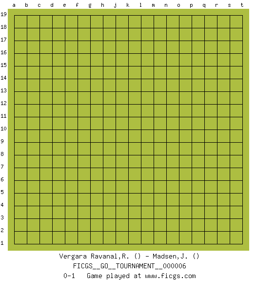 Last move : 0-1 2006 August 1 23:0:34 [Event "FICGS__GO__TOURNAMENT__000006"] [Site "FICGS"] [Date "2006.07.18"] [Round "1"] [Black "Vergara Ravanal,Raul Andres"] [White "Madsen,John"] [Result "0-1"] 0-1 Here are the names of the openings (joseki) played in the four corners : Player White won this Go (weiqi, baduk) game. Follow this game move after move (download)Error is one of the sources of transformation. (Pierre Audouard) To be champion requires more than simply being a strong player; one has to be a strong human being as well. (Anatoly Karpov)
