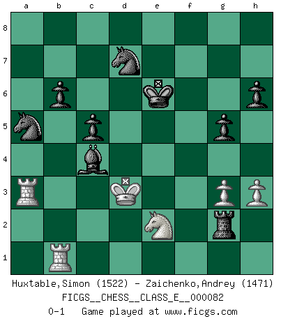 Last move : 0-1 2008 August 1 18:8:51 [Event "FICGS__CHESS__CLASS_E__000082"] [Site "FICGS"] [Date "2008.05.16"] [Round "1"] [White "Huxtable,Simon"] [Black "Zaichenko,Andrey"] [Result "0-1"] [WhiteElo "1522"] [BlackElo "1471"] 1.d4 Nf6 2.Bg5 e6 3.e4 Be7 4.e5 Nd5 5.Bxe7 Qxe7 6.a3 d6 7.c4 Nb6 8.b4 dxe5 9.dxe5 c5 10.Nf3 N6d7 11.b5 a6 12.Nc3 f6 13.Qd6 fxe5 14.Qxe7+ Kxe7 15.a4 b6 16.g3 Bb7 17.Bg2 Rf8 18.Ke2 axb5 19.Nxb5 Bc6 20.Rhd1 Kf6 21.Bh3 h6 22.Ng1 g5 23.Bxe6 Kxe6 24.Nc7+ Ke7 25.Nxa8 Bxa8 26.a5 Nc6 27.a6 Nb4 28.a7 Nc6 29.Ke3 Bb7 30.Ra3 Ra8 31.Rda1 Na5 32.Kd3 Rxa7 33.Ne2 Ra8 34.f4 Rf8 35.Re1 Ba6 36.Ke3 Bxc4 37.fxe5 Nxe5 38.Ke4 Ke6 39.Rb1 Nd7 40.Ng1 Bd5+ 41.Kd3 Rf2 42.h3 Rg2 43.Ne2 Bc4+ 0-1 Trompowsky attack (Ruth, Opovcensky Opening) Player Black won this chess game. Follow this game move after move (download)In a gambit you give up a Pawn for the sake of getting a lost game. (Samuel Standige Boden) Fischer ist das größte Genie, das je vom Schachhimmel heruntergestiegen ist. (Mikhail Nekhemyevich Tal) Cuando tengas duda... ¡juega al Ajedrez!. (Tevis) Aux échecs, les retours au sommet sont rares : les dommages psychologiques consécutifs à une défaite sont trop sévères. (Daily Telegraph) Vladimir Ras-Putin is still alive... He is also a good actor, I saw him in the Lord of the Rings. (Rodolfo d'Ettorre)
