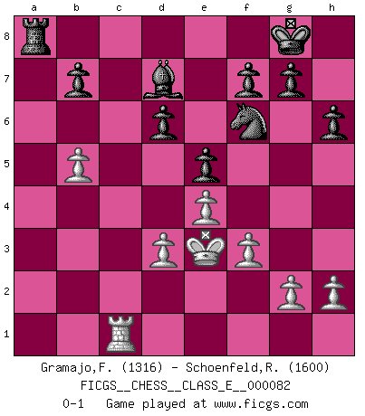 Last move : 0-1 2008 June 16 2:56:9 [Event "FICGS__CHESS__CLASS_E__000082"] [Site "FICGS"] [Date "2008.05.16"] [Round "1"] [White "Gramajo,Francisco"] [Black "Schoenfeld,Ralf"] [Result "0-1"] [WhiteElo "1316"] [BlackElo "1600"] 1.e4 e5 2.Nf3 Nc6 3.Bb5 Bd6 4.d3 a6 5.Bc4 Na5 6.Bd5 c6 7.Ng5 cxd5 8.Qf3 Qf6 9.Qxf6 Nxf6 10.f3 h6 11.Nh3 Bc5 12.a3 Ba7 13.Bd2 Nc6 14.Nc3 d4 15.Nf2 dxc3 16.Bxc3 Bxf2+ 17.Kxf2 d6 18.Rhe1 Nd4 19.Rac1 Nb5 20.Bb4 a5 21.c4 axb4 22.cxb5 bxa3 23.bxa3 O-O 24.Rc7 Rxa3 25.Ke3 Rd8 26.Rec1 Ra8 27.Re7 Rd7 28.Rxd7 Bxd7 0-1 Ruy Lopez (Spanish Opening) Kingside Castling by player Black (move 23) Player Black won this chess game. Follow this game move after move (download)When you don't know what to play, wait for an idea to come into your opponent's mind. You may be sure that idea will be wrong. (Siegbert Tarrasch) Ich kämpfe solange mein Gegner einen Fehler machen kann. (Emanuel Lasker) El Ajedrez es el gimnasio de la mente. (Blaise Pascal) Le pion, dans sa simplicité, marche droit devant lui, mais lorsqu'il prend, il le fait obliquement? Ainsi l'homme, tant qu'il reste pauvre, marche dans la droiture et vit honnêtement, mais lorsqu'il recherche les honneurs, il flatte, se parjure et, par les voies obliques, cherche une position supérieure sur l'échiquier du monde. (Jean de Galles) Art is the only way to run away without leaving home. (Twyla Tharp)