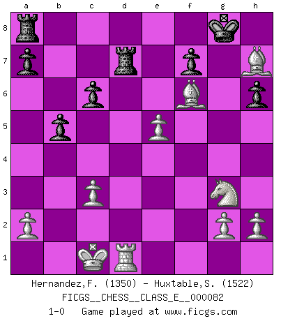 Last move : 1-0 2008 June 24 16:18:25 [Event "FICGS__CHESS__CLASS_E__000082"] [Site "FICGS"] [Date "2008.05.16"] [Round "1"] [White "Hernandez,Francisco"] [Black "Huxtable,Simon"] [Result "1-0"] [WhiteElo "1350"] [BlackElo "1522"] 1.e4 c6 2.d4 d5 3.Nc3 dxe4 4.Nxe4 Bf5 5.f3 e6 6.Ne2 e5 7.Be3 Bxe4 8.fxe4 Qh4+ 9.Ng3 Nf6 10.Bd3 Ng4 11.Qf3 Bb4+ 12.c3 Bd6 13.O-O-O O-O 14.Nf5 Qf6 15.Qxg4 Rd8 16.Rhf1 Qg6 17.Qh4 Nd7 18.Rf3 Nf6 19.Bg5 Rd7 20.Bh6 Qh5 21.Qg3 Qg6 22.Bxg7 exd4 23.Bxf6 Bxg3 24.Rxg3 Qxg3 25.Nxg3 dxc3 26.bxc3 h6 27.e5 b5 28.Bh7+ 1-0 Caro-Kann : Classical variation Queenside Castling by player White (move 13) Kingside Castling by player Black (move 13) Player White won this chess game. Follow this game move after move (download)I have added these principles to the law: get the Knights into action before both Bishops are developed. (Emanuel Lasker) Heutzutage gewinnt im Turnier nicht derjenige Spieler, der weitreichende Pläne entwirft, sondern einfach jener, der Zug um Zug kämpft. (David Bronstein) Robert Fischer es la ley hacia si mismo. (Larry Evans) Aux échecs, l'amour-propre est satisfait quand on remporte la victoire, mais il n'y a pas de honte à être battu. (Benjamin Franklin) A married woman is like a fish riding a bicycle. (Rodolfo d'Ettorre)