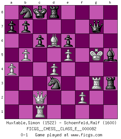 Last move : 0-1 2008 June 13 15:45:30 [Event "FICGS__CHESS__CLASS_E__000082"] [Site "FICGS"] [Date "2008.05.16"] [Round "1"] [White "Huxtable,Simon"] [Black "Schoenfeld,Ralf"] [Result "0-1"] [WhiteElo "1522"] [BlackElo "1600"] 1.d4 d5 2.Nf3 Nc6 3.e3 Bg4 4.Be2 Nf6 5.Nbd2 e6 6.c4 Bb4 7.cxd5 Nxd5 8.O-O f6 9.a3 Bxd2 10.Bxd2 Qd6 11.h3 Bh5 12.Bd3 Bg6 13.e4 Nde7 14.Bc3 O-O-O 15.b4 Bf7 16.b5 Nb8 17.Bb4 Qd7 18.a4 Bh5 19.g4 Bf7 20.Qc2 g5 21.Rac1 c6 22.e5 Nd5 23.Bd6 Nf4 24.Kh2 h5 25.Rg1 hxg4 26.Nxg5 fxg5 27.Kg3 Rxh3+ 28.Kxg4 Bh5+ 29.Kxg5 Nxd3 30.Rg3 Qg7+ 0-1 Queen's pawn game, Chigorin variation Kingside Castling by player White (move 8) Queenside Castling by player Black (move 14) Player Black won this chess game. Follow this game move after move (download)Chess is life. (Bobby Fischer) Ein Kibitz ist einer, der deinem Gegner gute Ratschläge gibt. (Andrew Soltis) Alekhine es un poeta que crea un trabajo de arte de algo que raramente inspiraría a otra persona a mandar una tarjeta postal. (Max Euwe) Fischer est le meilleur joueur du monde et Karpov n'est qu'un joueur de bistrot. (Garry Kasparov, agé de 16 ans) A journey of a thousand sites begins with a single click. (Author unknown)